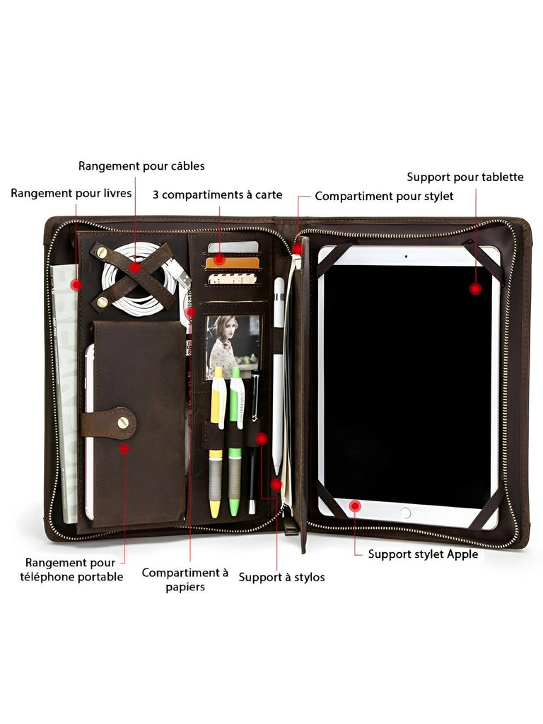L'intérieur comprend plusieurs compartiments pratiques : un emplacement sécurisé pour votre tablette, trois emplacements pour cartes, un compartiment pour votre téléphone portable et même des supports pour stylos et stylus. La fermeture éclair robuste assure une protection optimale de vos effets personnels.