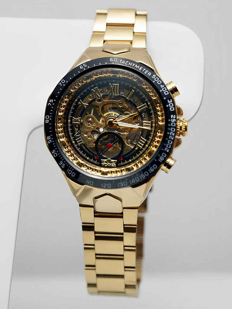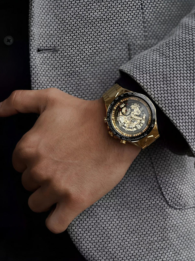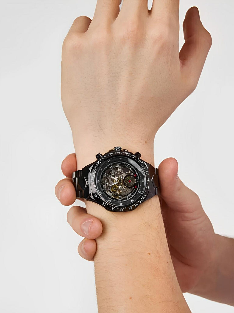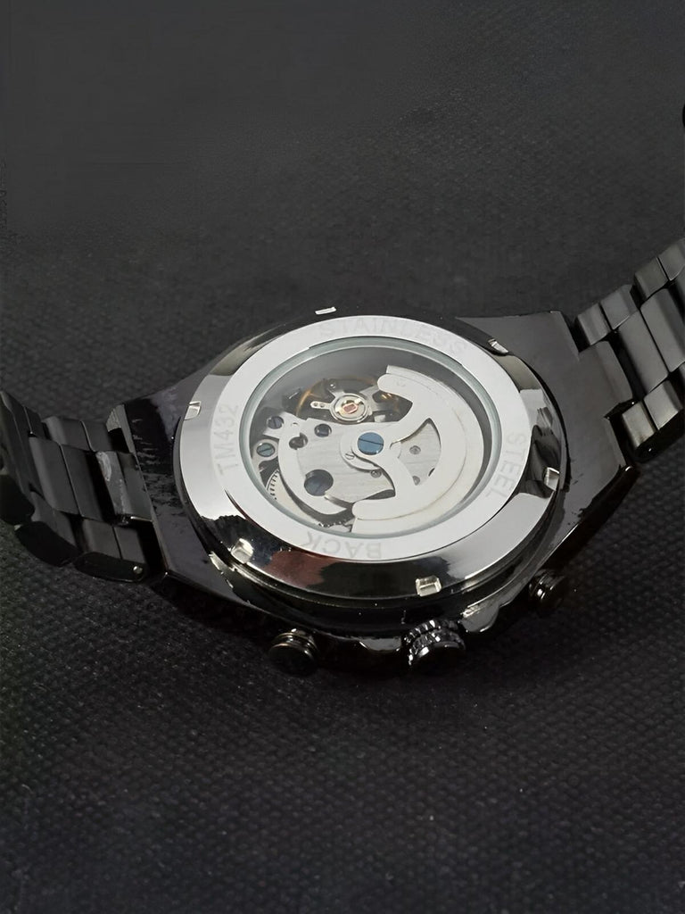 Découvrez l'élégance et la technicité avec cette montre mécanique automatique, une pièce qui allie précision et esthétisme. Son cadran squelette met en valeur l'ingénierie du mécanisme en mouvement, offrant une vue fascinante sur la complexité de l'horlogerie.