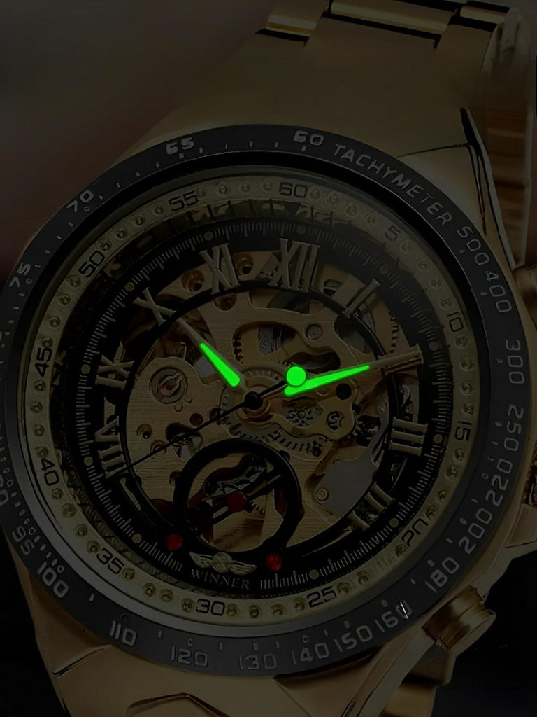 Montre squelette mécanique, cadran transparent, acier inoxydable, mouvement automatique, design luxueux, modèle Denzel