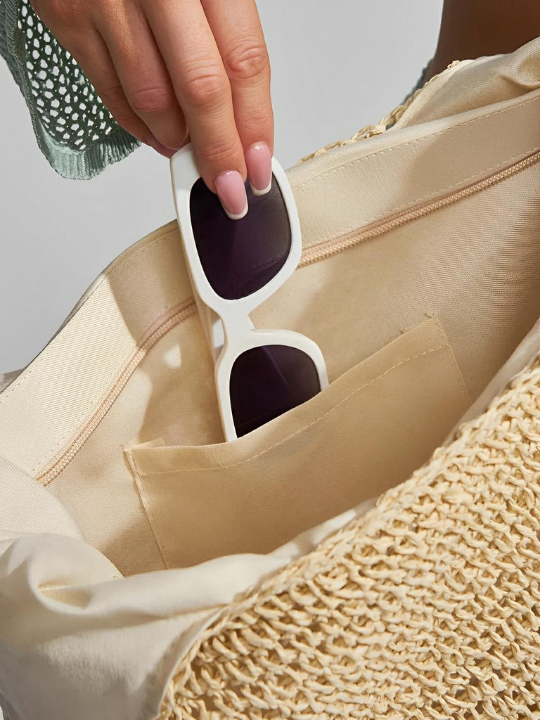 Son format généreux permet d’y glisser tout le nécessaire : serviette, lunettes, livre ou crème solaire. La fermeture zippée sécurise l’ensemble, tandis que l’intérieur en douce toile de coton accueille deux poches pratiques, dont une spécialement pensée pour le téléphone ou les lunettes.