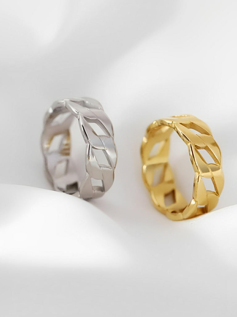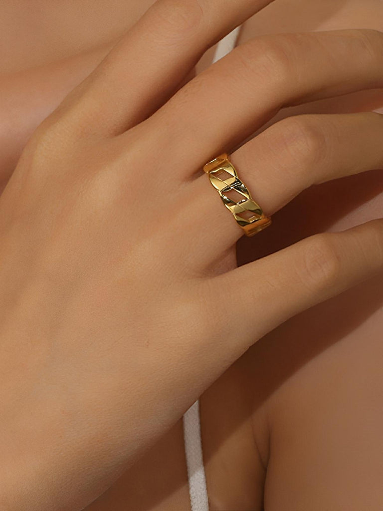 Évoquant une esthétique moderne et sculpturale, cette bague en acier inoxydable plaqué or 18K séduit par son design creux et ses lignes ondulées. Sa forme géométrique irrégulière lui confère une allure distinctive, idéale pour sublimer vos gestes au quotidien.