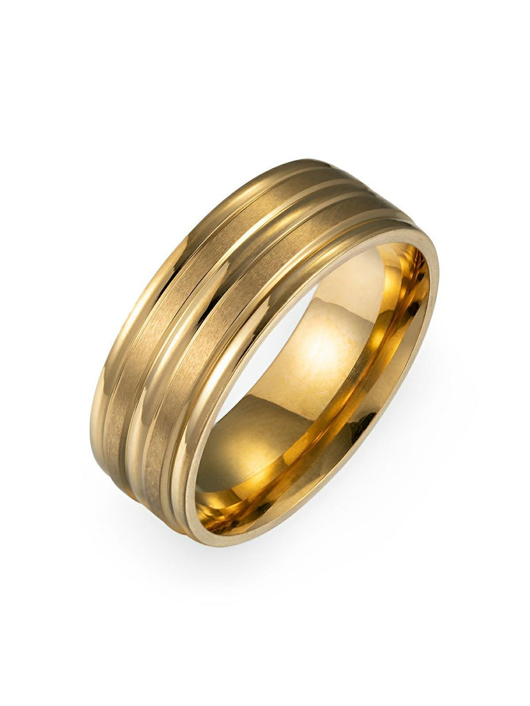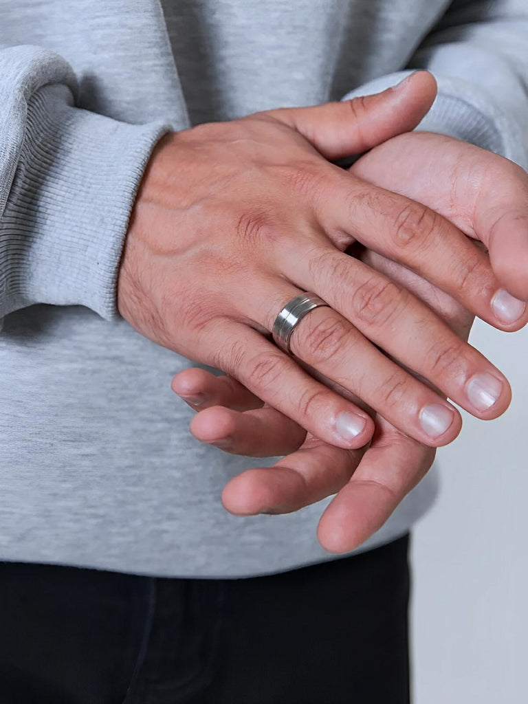 Conçue pour ceux qui recherchent un accessoire robuste et affirmé, cette bague en acier inoxydable se décline en trois finitions : noir profond, doré intense ou argent brossé. Sa largeur de 8mm et ses gorges symétriques centrales lui confèrent une allure puissante et contemporaine, idéale pour structurer une tenue avec caractère.