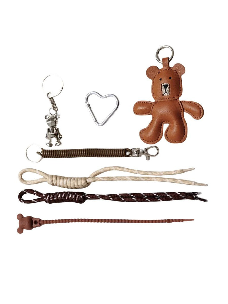 Ce charm est enrichi d’un mousqueton métallique en forme de cœur, de cordons tressés beige et chocolat, d’une spirale effet ressort et d’un pendentif ourson en métal, formant un ensemble accrocheur et plein de caractère.