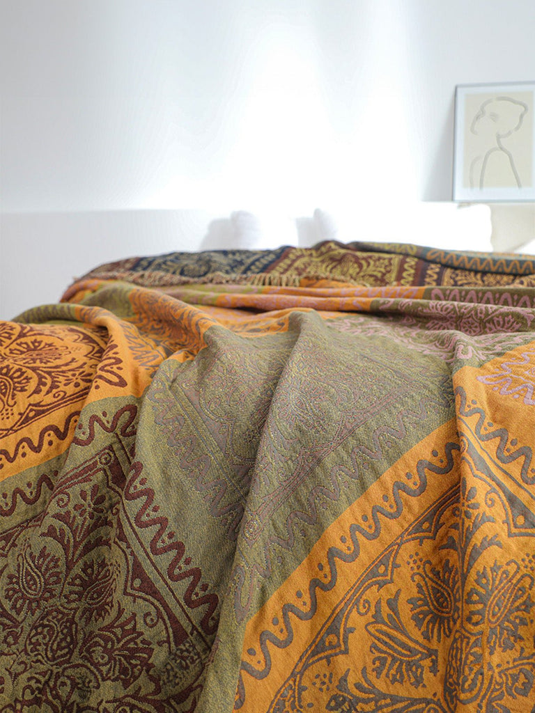Ce plaid en coton grand format est une invitation à la détente. Avec ses dimensions généreuses de 250 x 230 cm, il transforme votre lit ou canapé en un cocon visuel et sensoriel. Les motifs inspirés de l’univers bohème, dans des tons chauds de jaune, olive, terracotta et brun, apportent du relief et du caractère à votre intérieur.