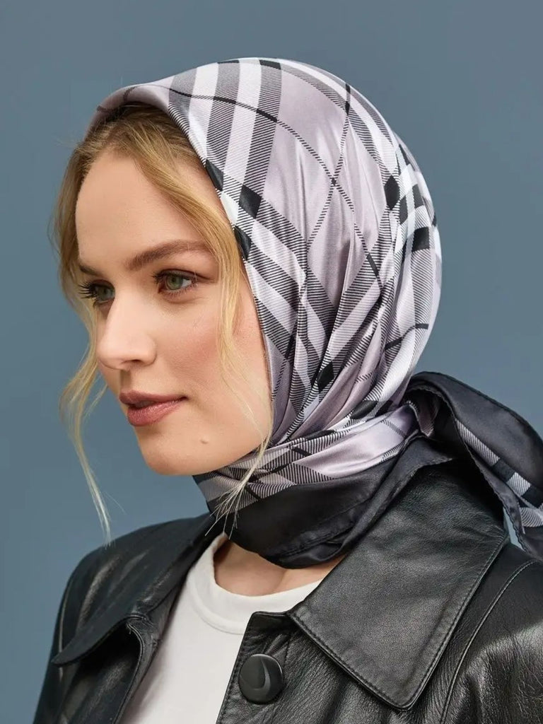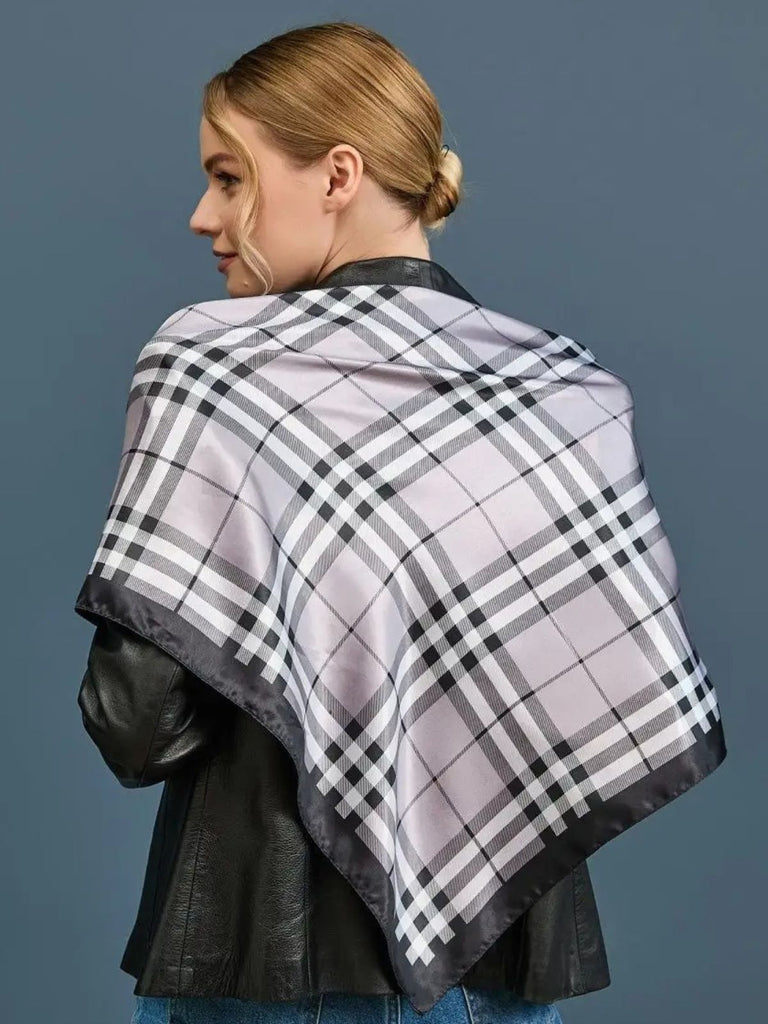 Foulard carré femme 90x90, imprimé à carreaux, soyeux et effet satiné, accessoire cheveux ou cou, gris noir blanc, foulard tendance respirant, foulard doux polyester, modèle Vannya