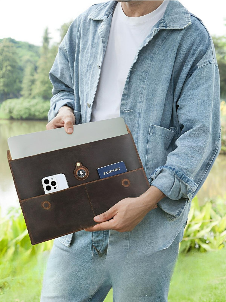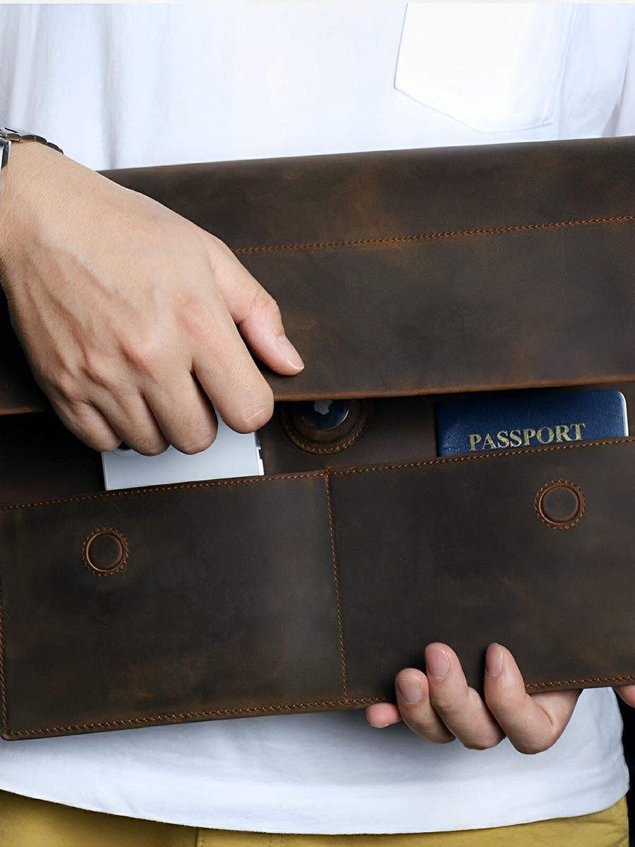 Il suo stile minimalista e la finitura in vera pelle la rendono un accessorio indispensabile per professionisti e viaggiatori esigenti. Sottile e leggera, si inserisce facilmente in una borsa o si porta sotto il braccio per un tocco di raffinatezza.