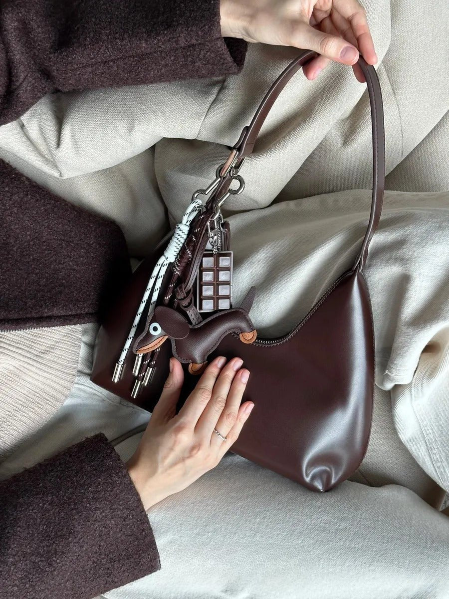 Bijou da borsa cane, ciondolo cioccolato, moschettone osso, cordini tessili, marrone bianco, modello Adou