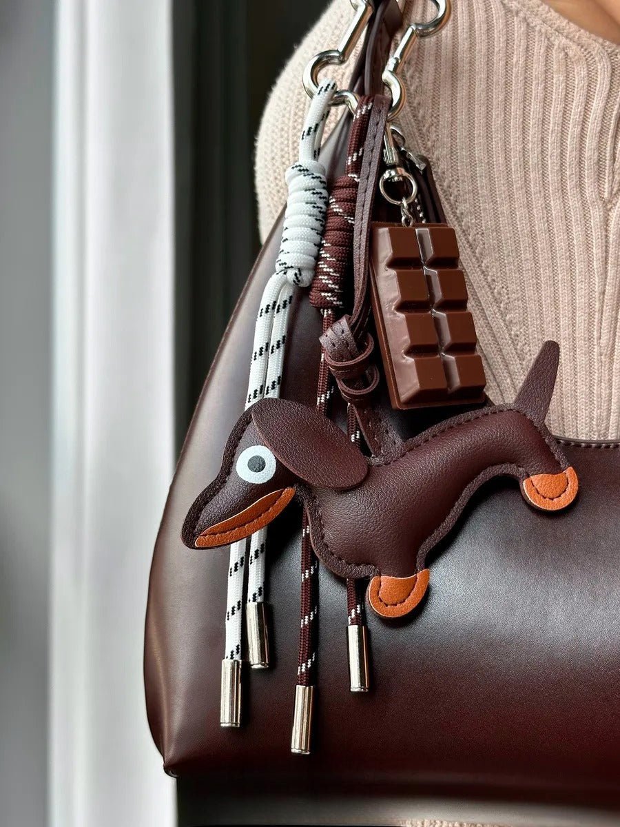 Aggiungete un tocco di fantasia ai vostri accessori con questo bijou da borsa dall’aspetto irresistibilmente goloso e gioioso. Composto da cinque elementi distinti, riunisce un’adorabile charm cane in simil cioccolato, un pendente a forma di tavoletta di cioccolato morbida, due cordoncini tessili (bianco e marrone) e un moschettone in acciaio a forma di osso argentato.