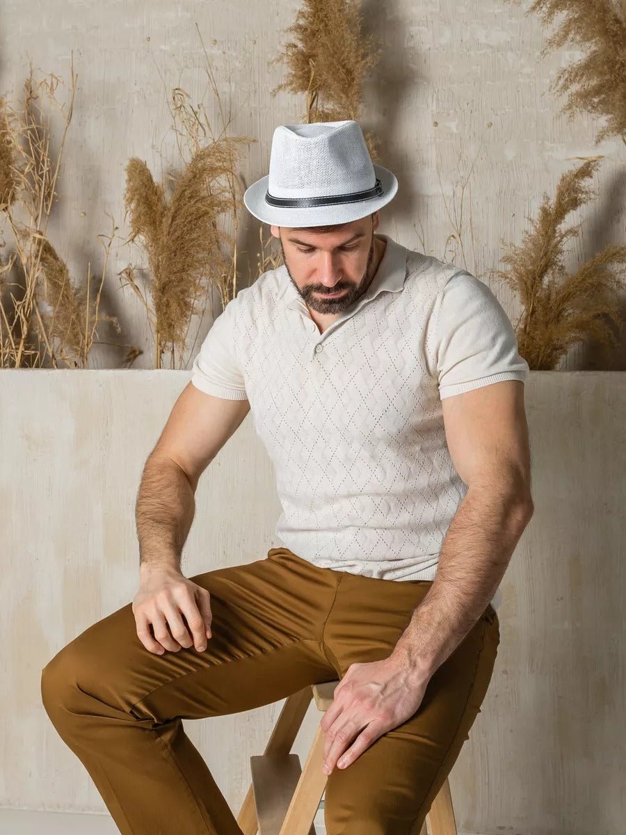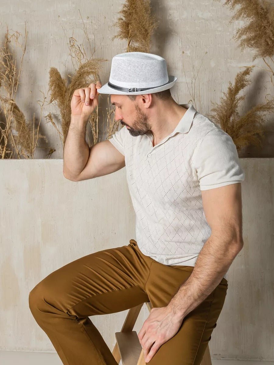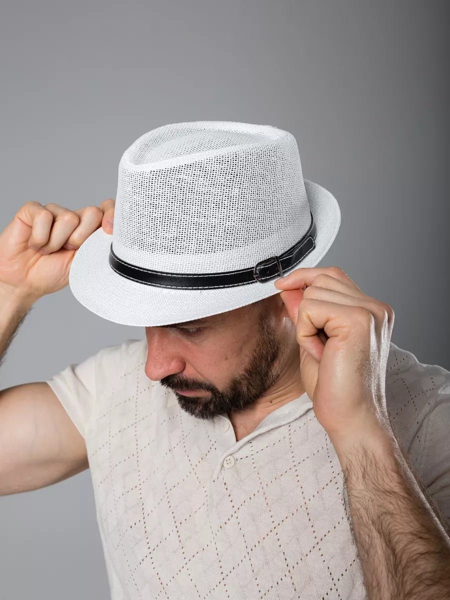Cappello di paglia estivo, bianco, stile fedora, ornato da una cintura nera, traspirante e anti UV, modello Alberto