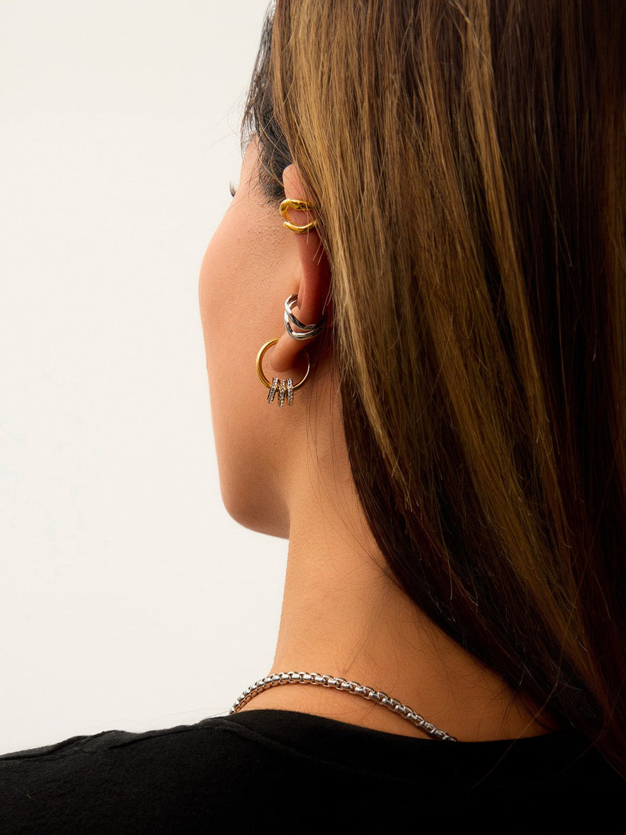 Disponibili in oro giallo o argento, possono essere indossati singolarmente o abbinati per creare un look d’orecchio personalizzato. Il formato compatto e il peso leggerissimo consentono un utilizzo prolungato senza alcun disagio.