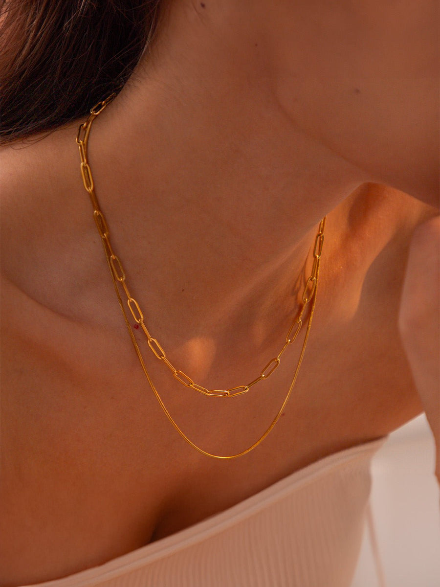 Questo collier a doppio giro gioca con gli stili e i volumi per creare un accessorio al tempo stesso moderno e di grande impatto. Abbina una catena snake sottile a una maglia rettangolare audace, formando un duo a contrasto e armonioso che valorizza il collo con un solo gesto.