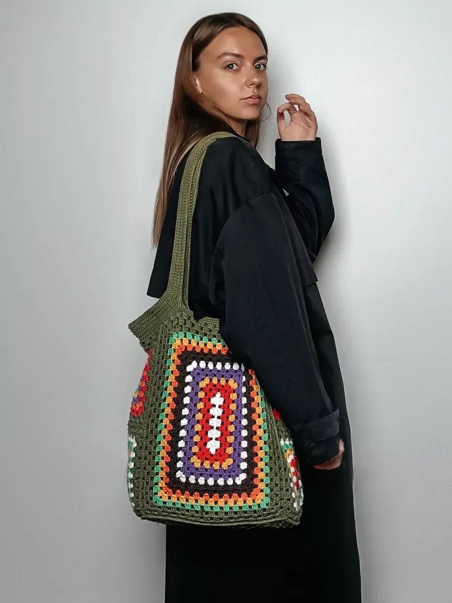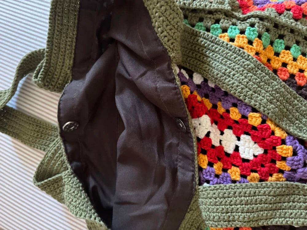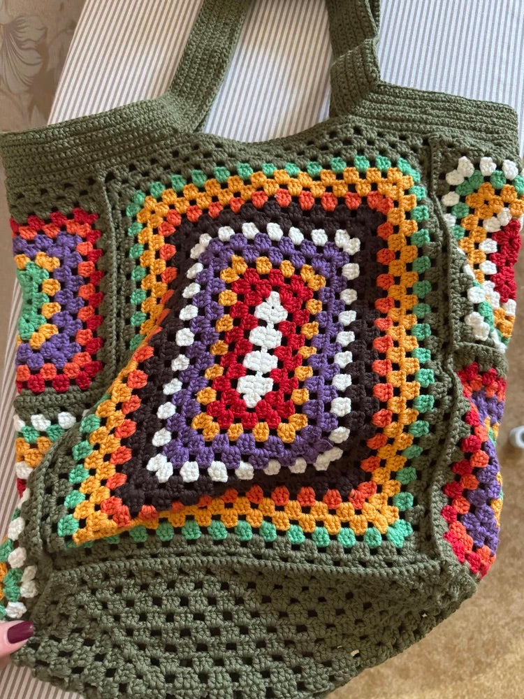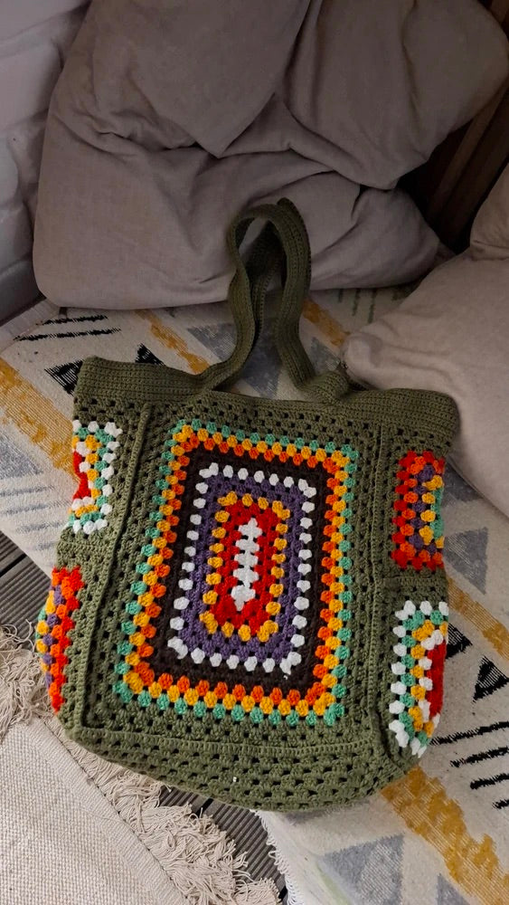 Tote-bag sac crochet multicolore, cabas bohémien, borsa a spalla morbida, tote bag vintage, borsa verde con manici lunghi, modello Amanda