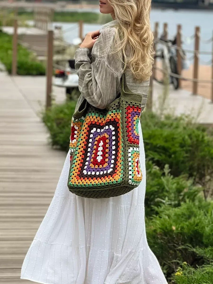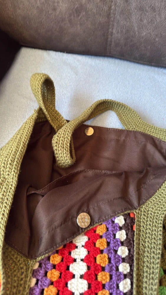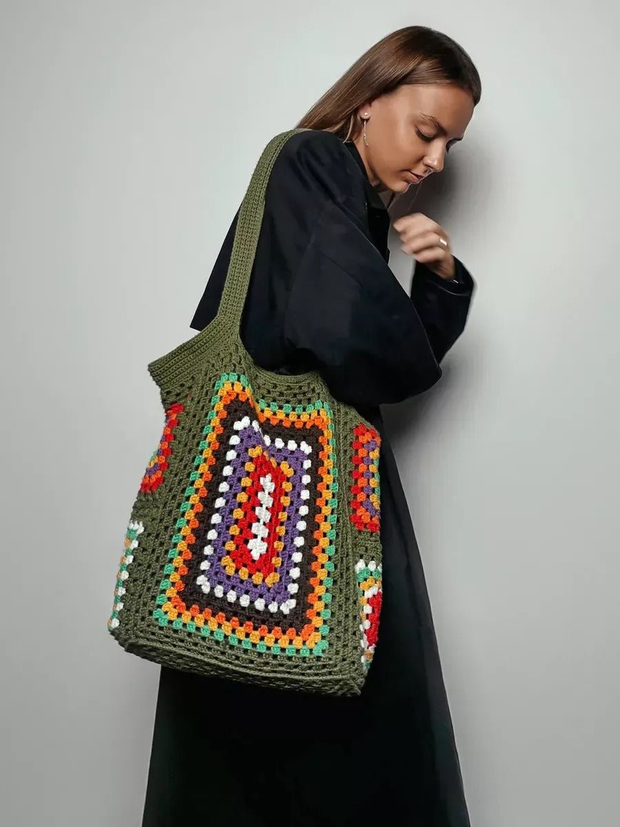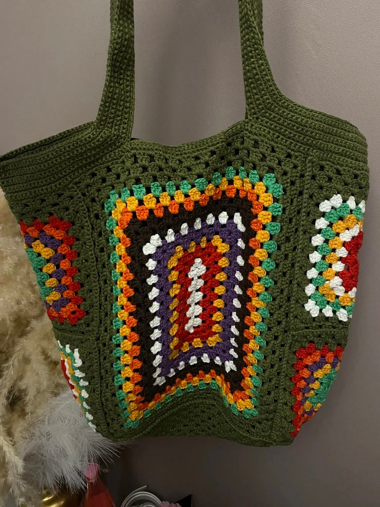 Tote-bag sac crochet multicolore, cabas bohémien, borsa a spalla morbida, tote bag vintage, borsa verde con manici lunghi, modello Amanda