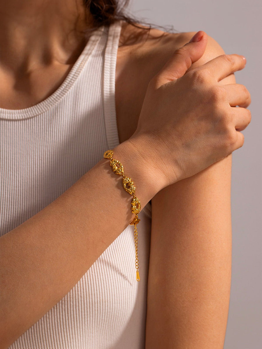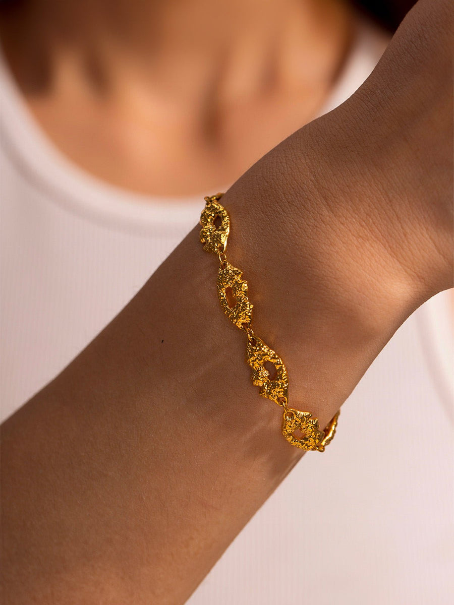 Questo bracciale geometrico placcato oro 18K reinterpreta i classici con un tocco moderno e audace. Realizzato in acciaio inossidabile di alta qualità, presenta una sequenza di elementi testurizzati e traforati dalle linee irregolari che catturano la luce da ogni angolazione.