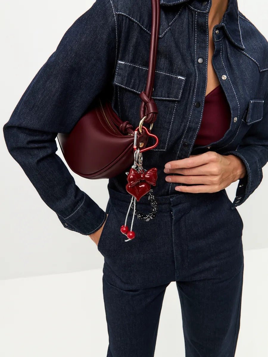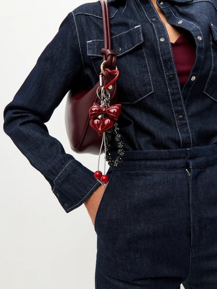 Questo bijou da borsa fantasia cattura immediatamente l’attenzione grazie alle sue charm a contrasto e al suo design espressivo. L’associazione di un cuore rosso brillante annodato con un fiocco, di un braccialetto di dadi neri e di perle colorate offre una composizione audace e ricca di carattere.