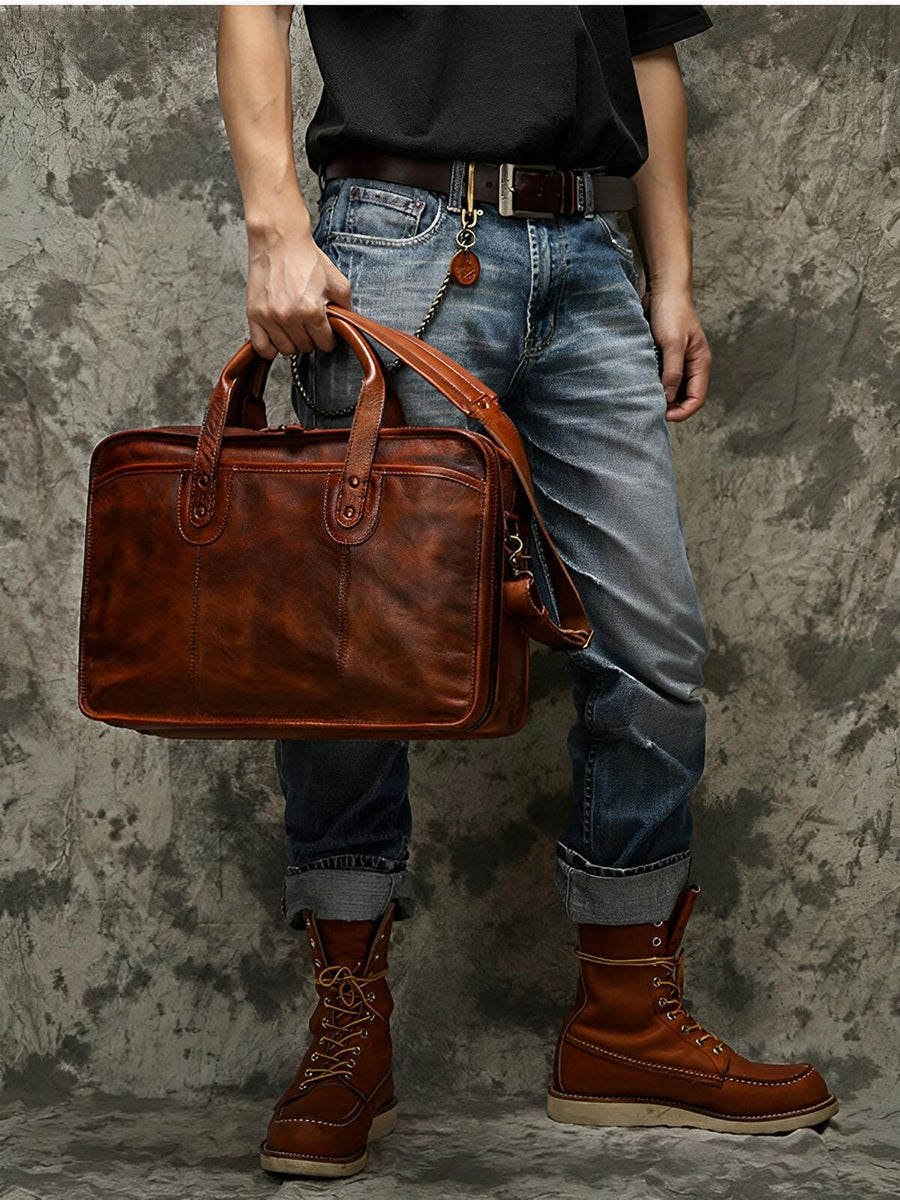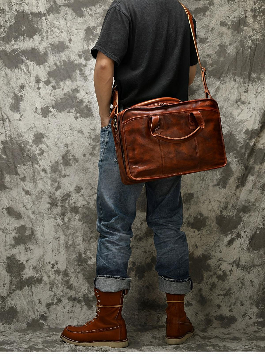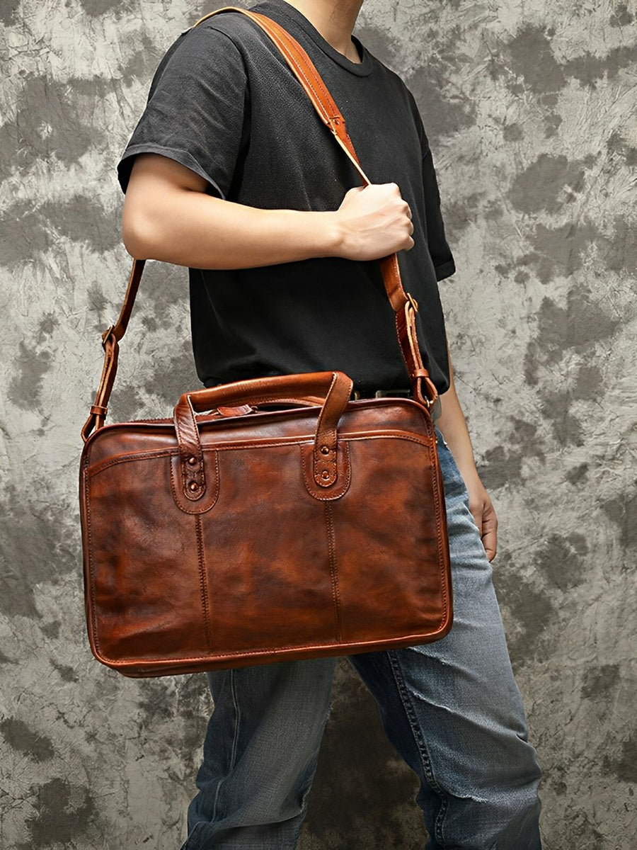 Porta-documenti vintage in pelle invecchiata per uomo, molto spazioso e organizzato, modello Anatole