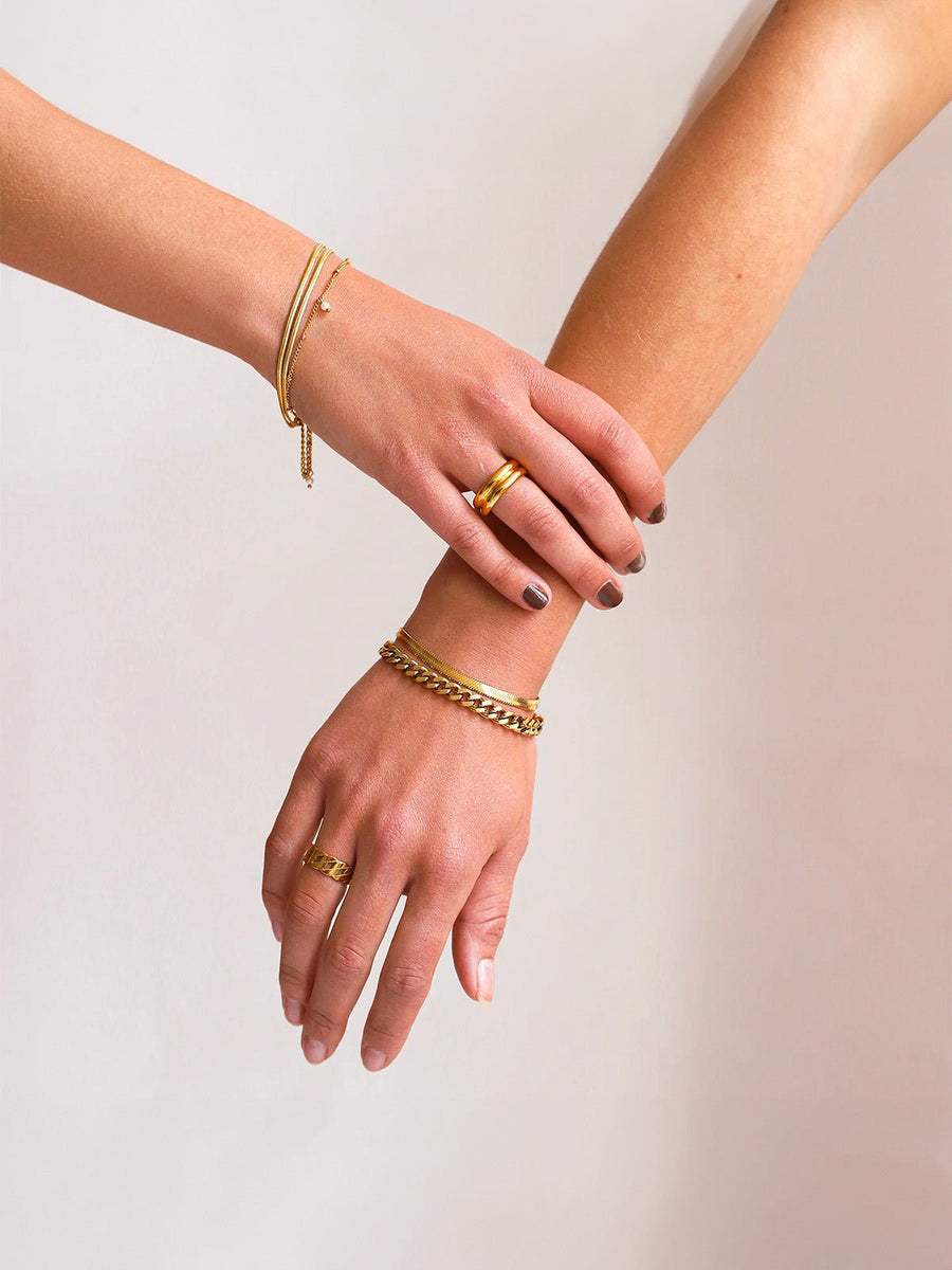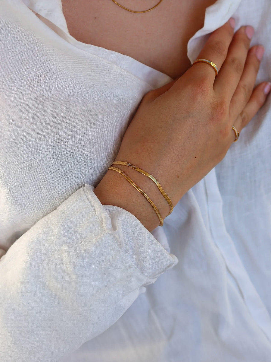 Questo bracciale da donna a doppia catena reinterpreta lo stile minimalista con una preziosa raffinatezza. Composto da due fili di maglia serpente herringbone flessibili e lucenti, si distingue per la sua finezza e il comfort al polso.