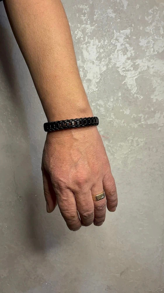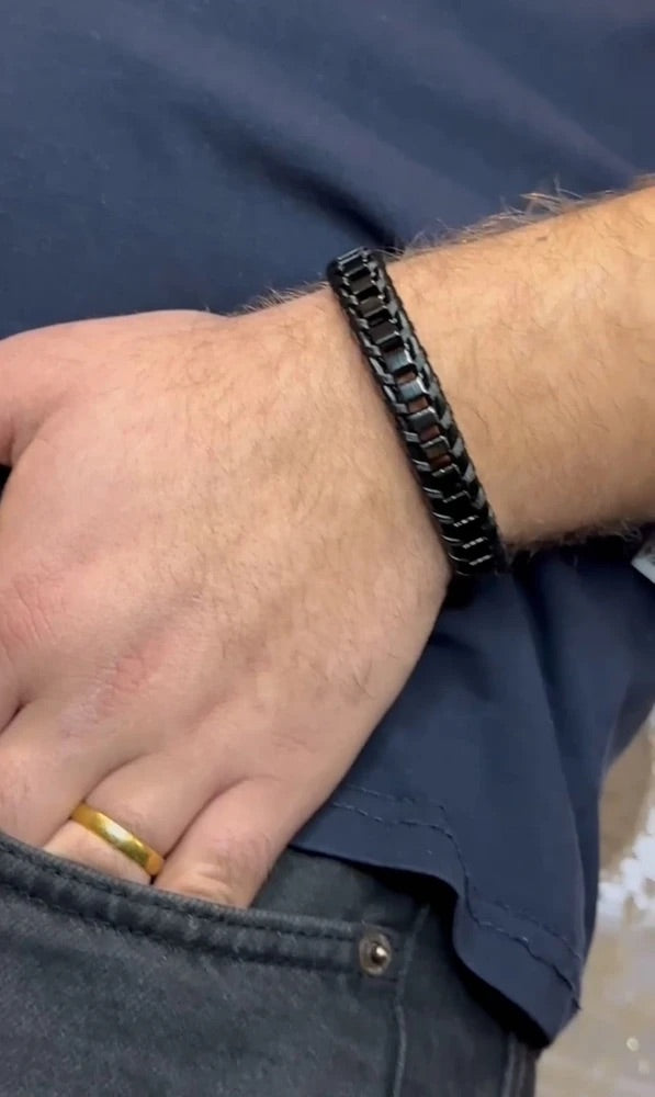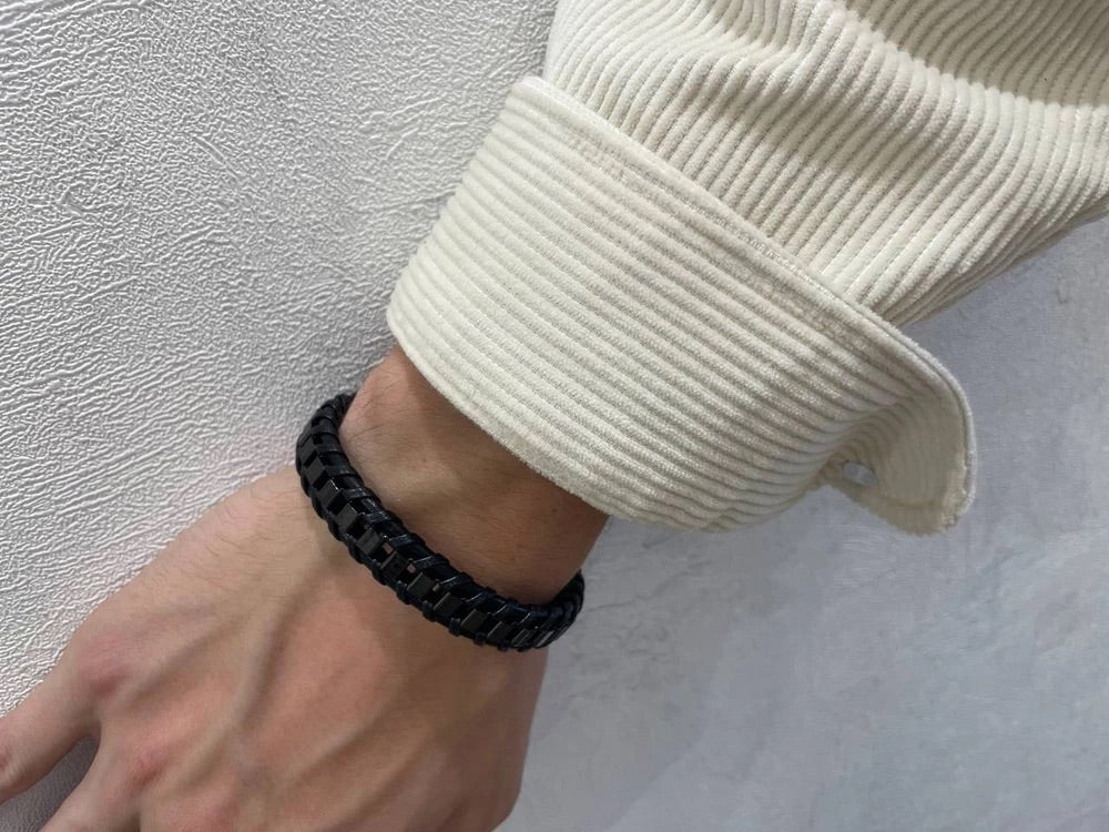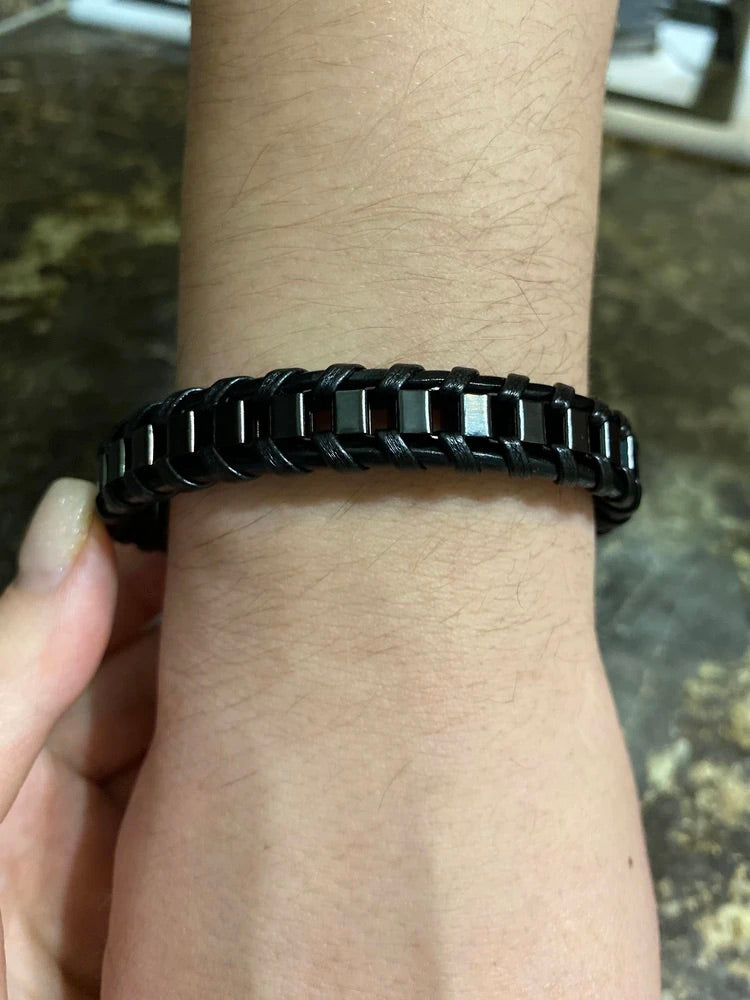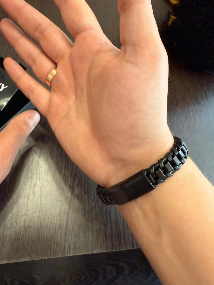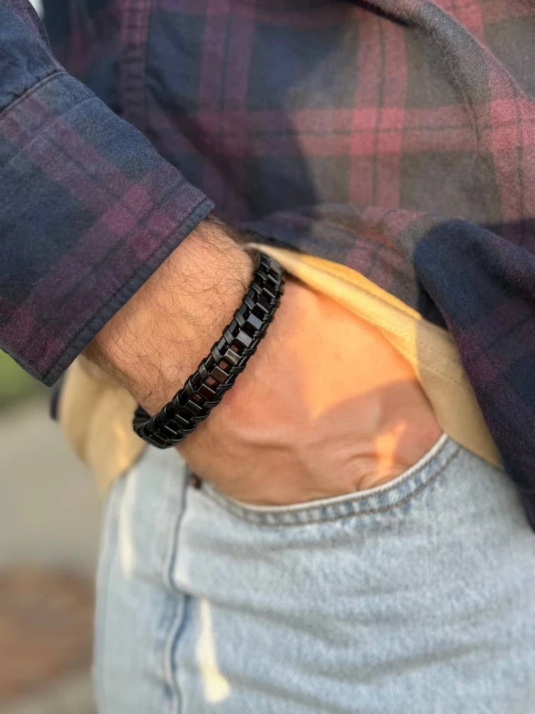 Questo bracciale è realizzato con pelle naturale intrecciata, offrendo un comfort ottimale e una piacevole flessibilità. La sua chiusura magnetica in acciaio inox garantisce una chiusura sicura e pratica, permettendo di indossarlo e toglierlo facilmente.