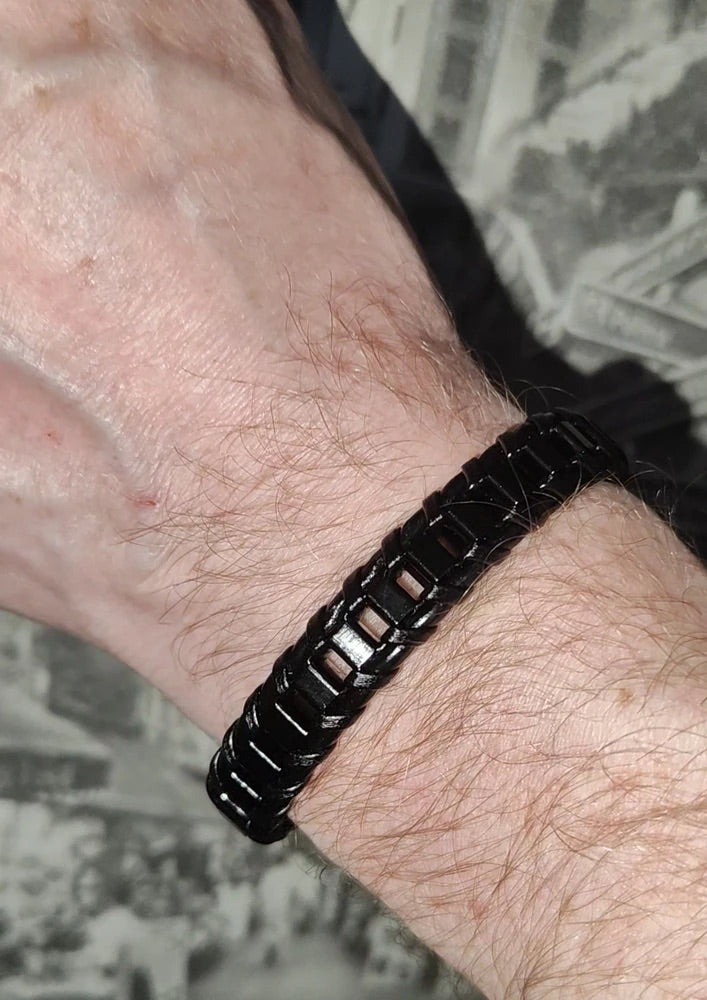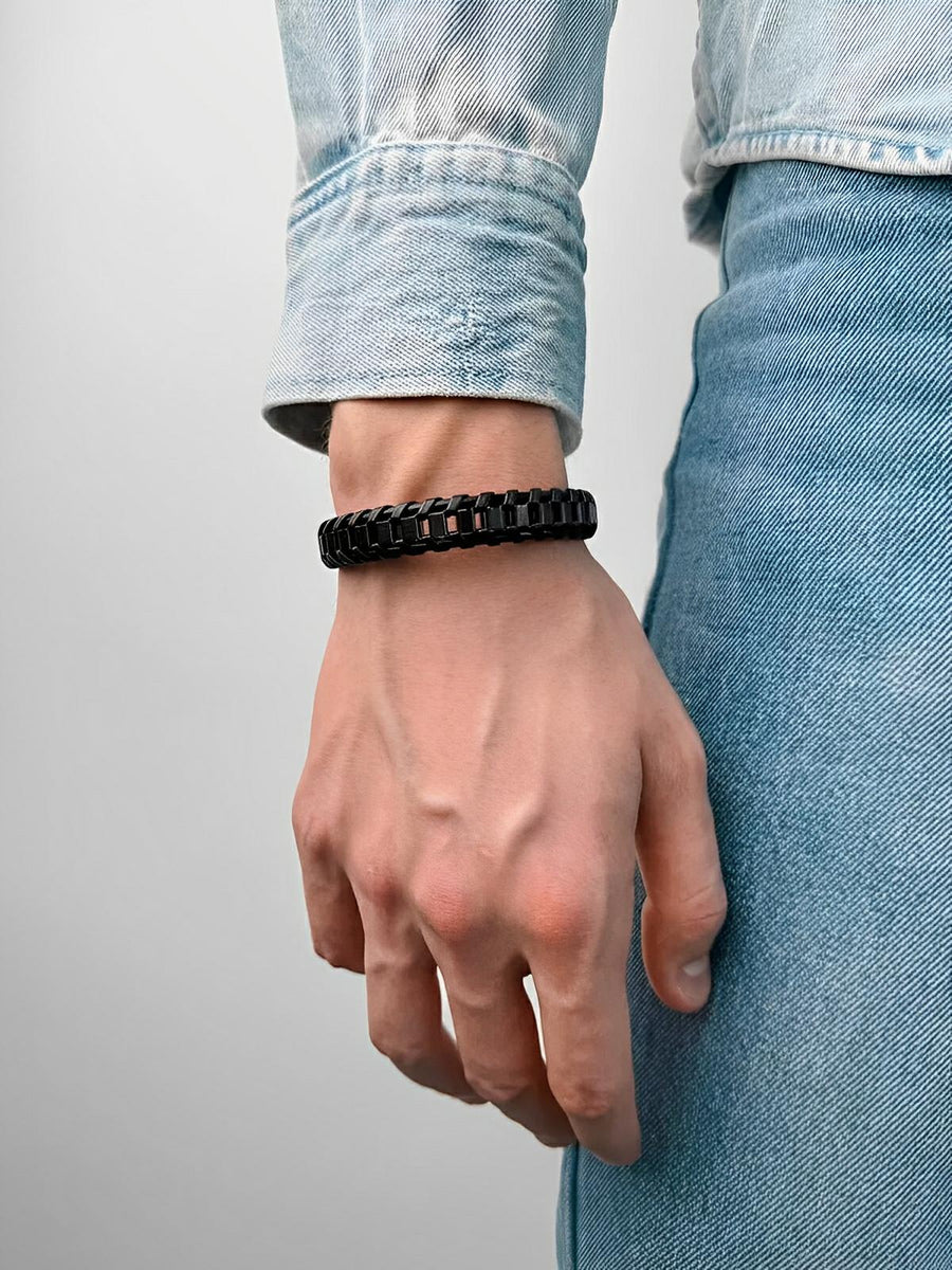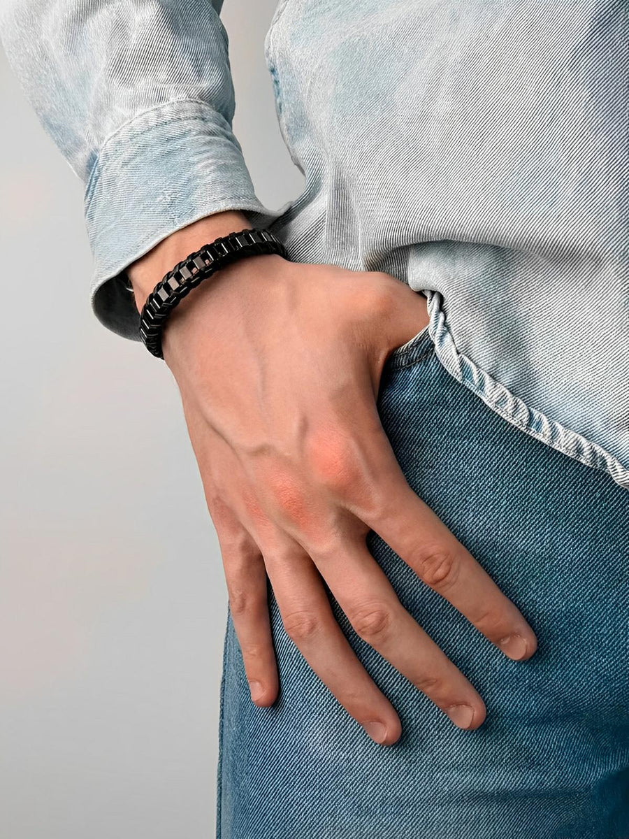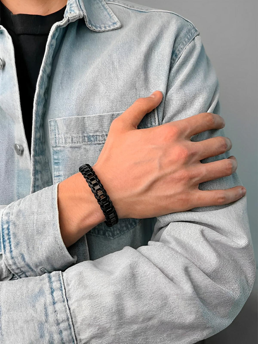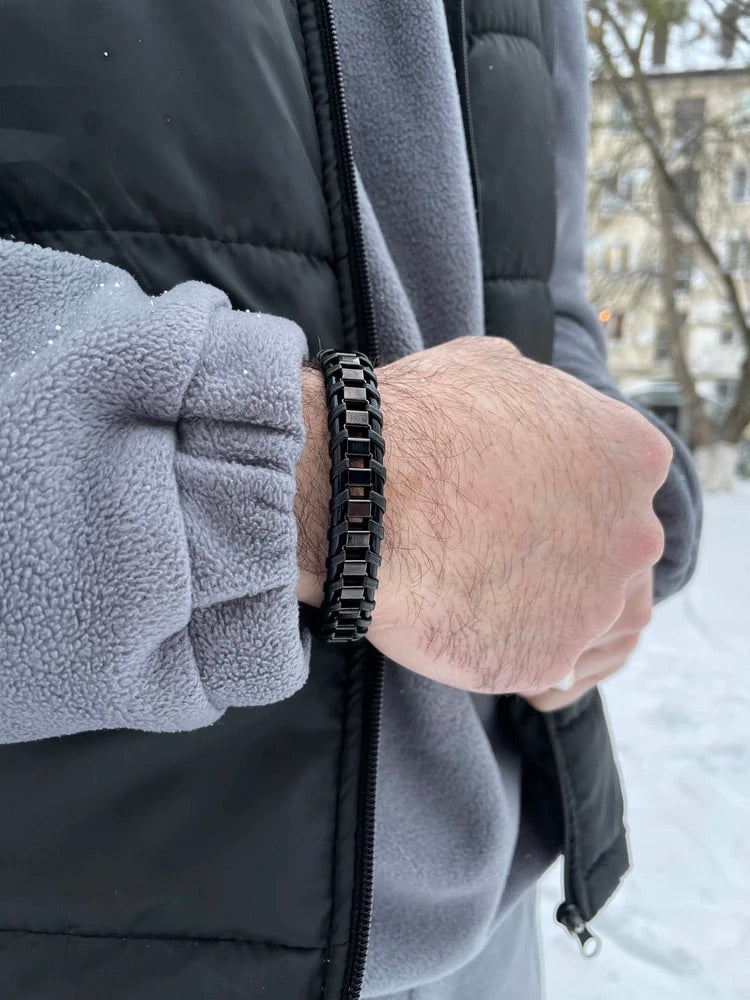 Questo bracciale è realizzato con pelle naturale intrecciata, offrendo un comfort ottimale e una piacevole flessibilità. La sua chiusura magnetica in acciaio inox garantisce una chiusura sicura e pratica, permettendo di indossarlo e toglierlo facilmente.