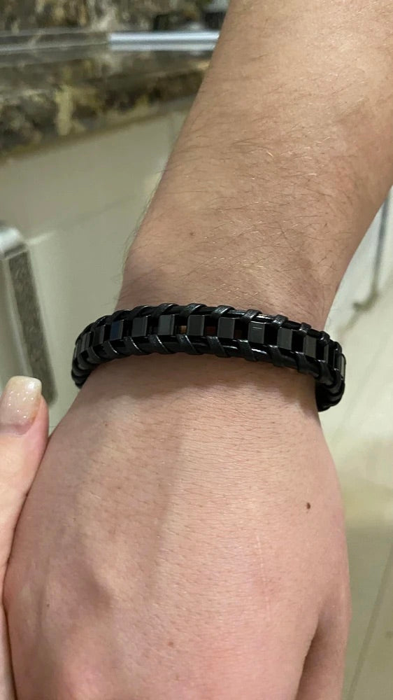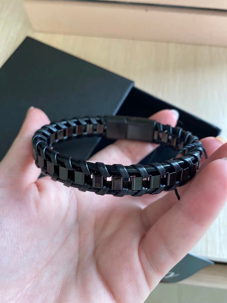 Bracciale intrecciato in pelle nera, acciaio inossidabile, chiusura magnetica, stile elegante, modello Arnaud