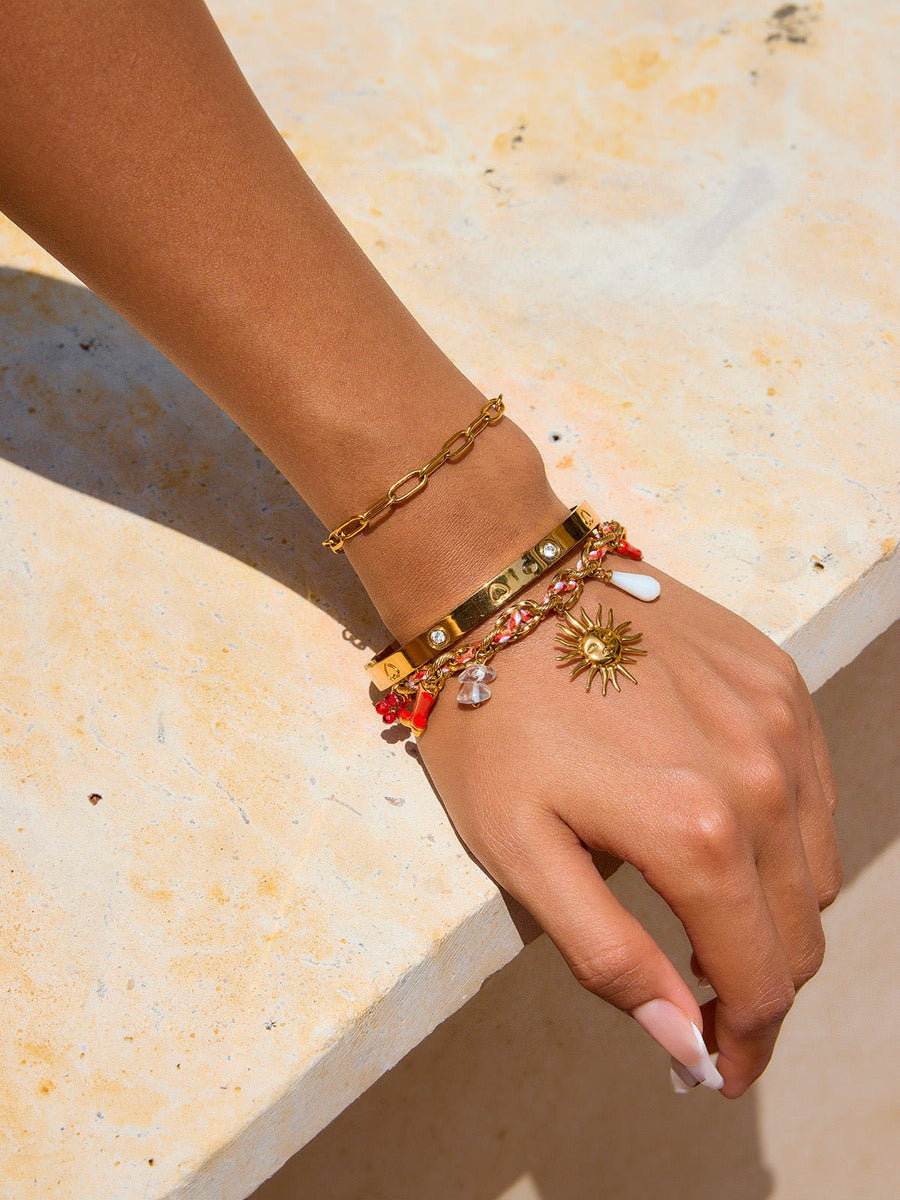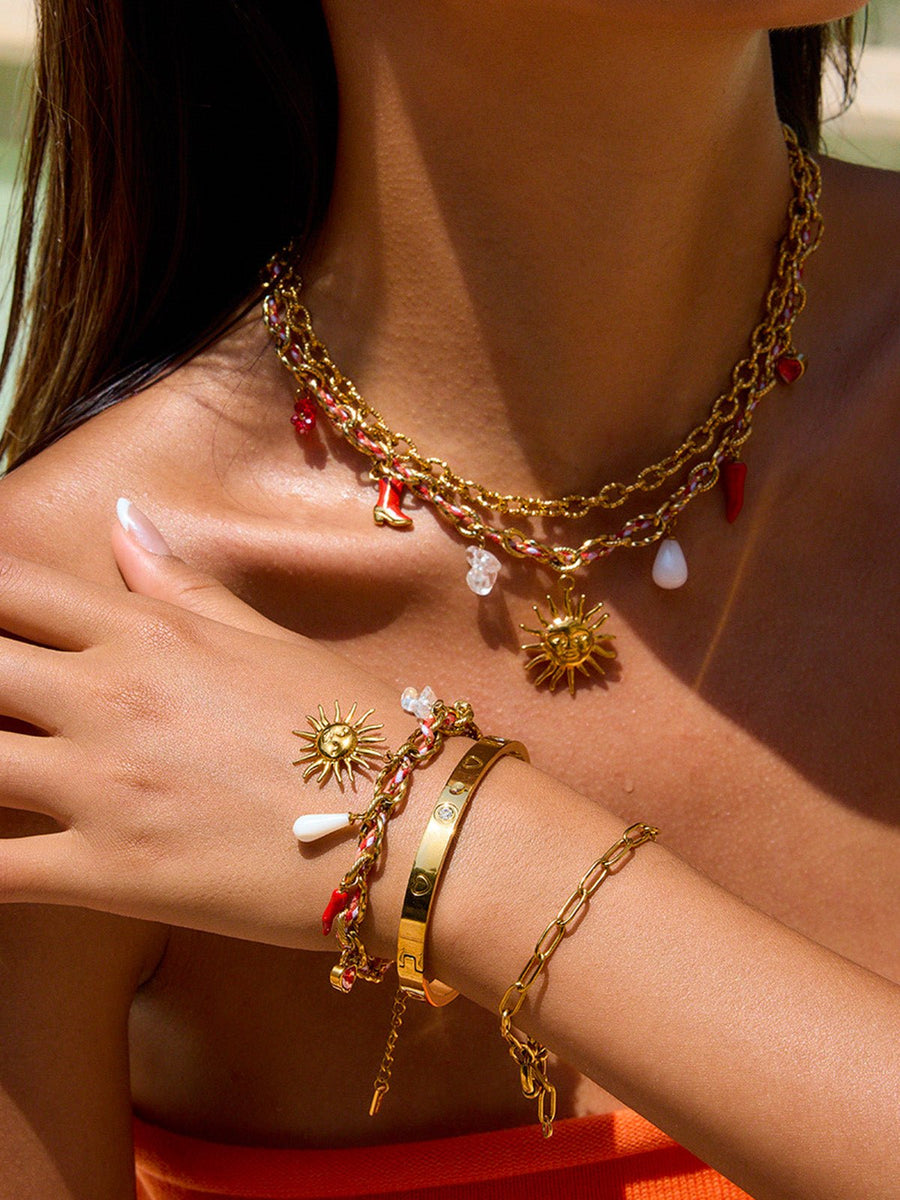Questo bracciale a catena dorata conquista per il suo stile solare e il suo carattere unico. Realizzato in acciaio inossidabile resistente all’acqua e ipoallergenico, è impreziosito da una serie di charms portafortuna: un sole raggiante, una goccia madreperlata, un cuore rosso brillante, un piccolo stivaletto e un corno rosso.