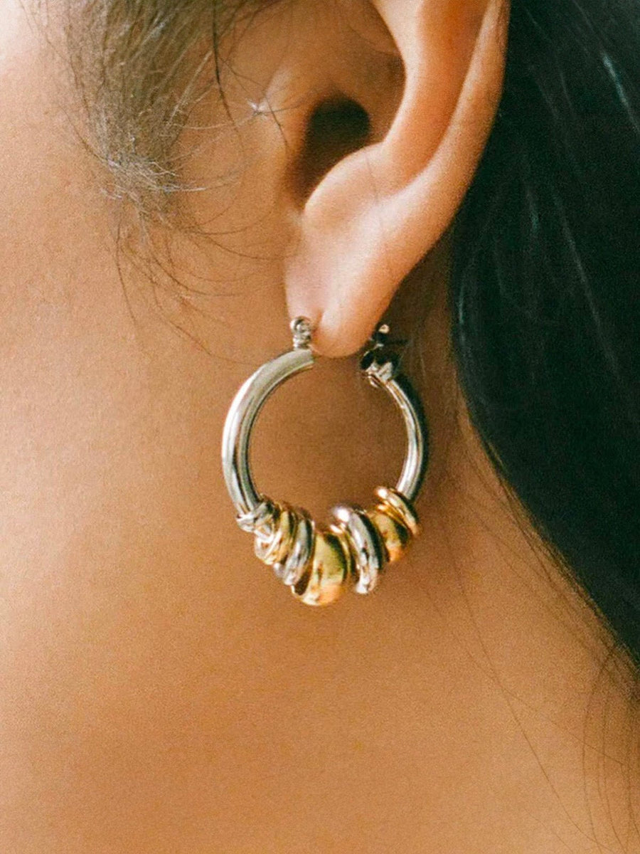 La loro struttura argentata o dorata è arricchita da perle mobili che aggiungono volume e movimento a ogni gesto. Grazie al fermaglio a scatto, si fissano in tutta sicurezza restando semplici da indossare.