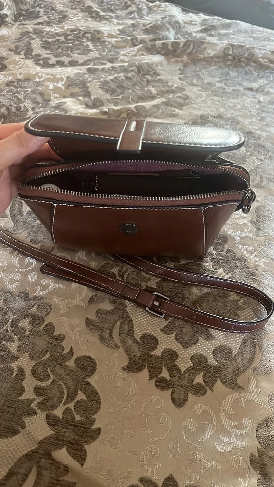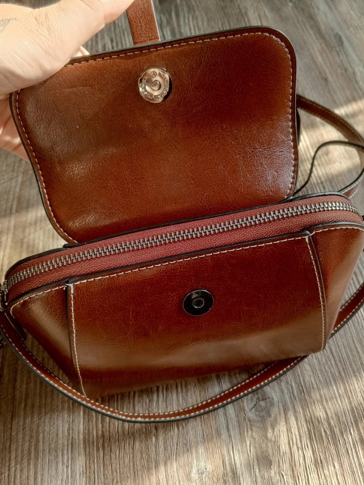 Ideata per l’ambiente urbano, si adatta a ogni ritmo grazie alla sua tracolla regolabile che consente di portarla a tracolla o a spalla. L’interno, foderato in tessuto bordeaux di qualità, offre tre scomparti ben definiti, tra cui una tasca con zip e uno spazio per il telefono cellulare.
