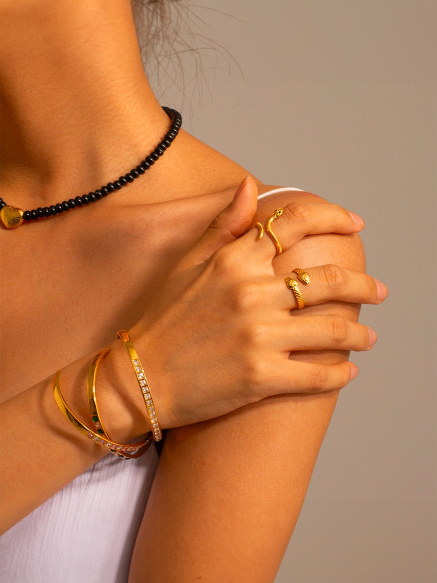 Laissez-vous séduire par cette bague ouverte au design sculptural, conçue pour souligner votre style avec caractère. Sa forme fluide et géométrique épouse le doigt dans un mouvement souple et affirmé. Réalisée en acier inoxydable et recouverte d’un placage or 18K, elle offre une brillance durable et un toucher lisse, agréable à porter au quotidien.