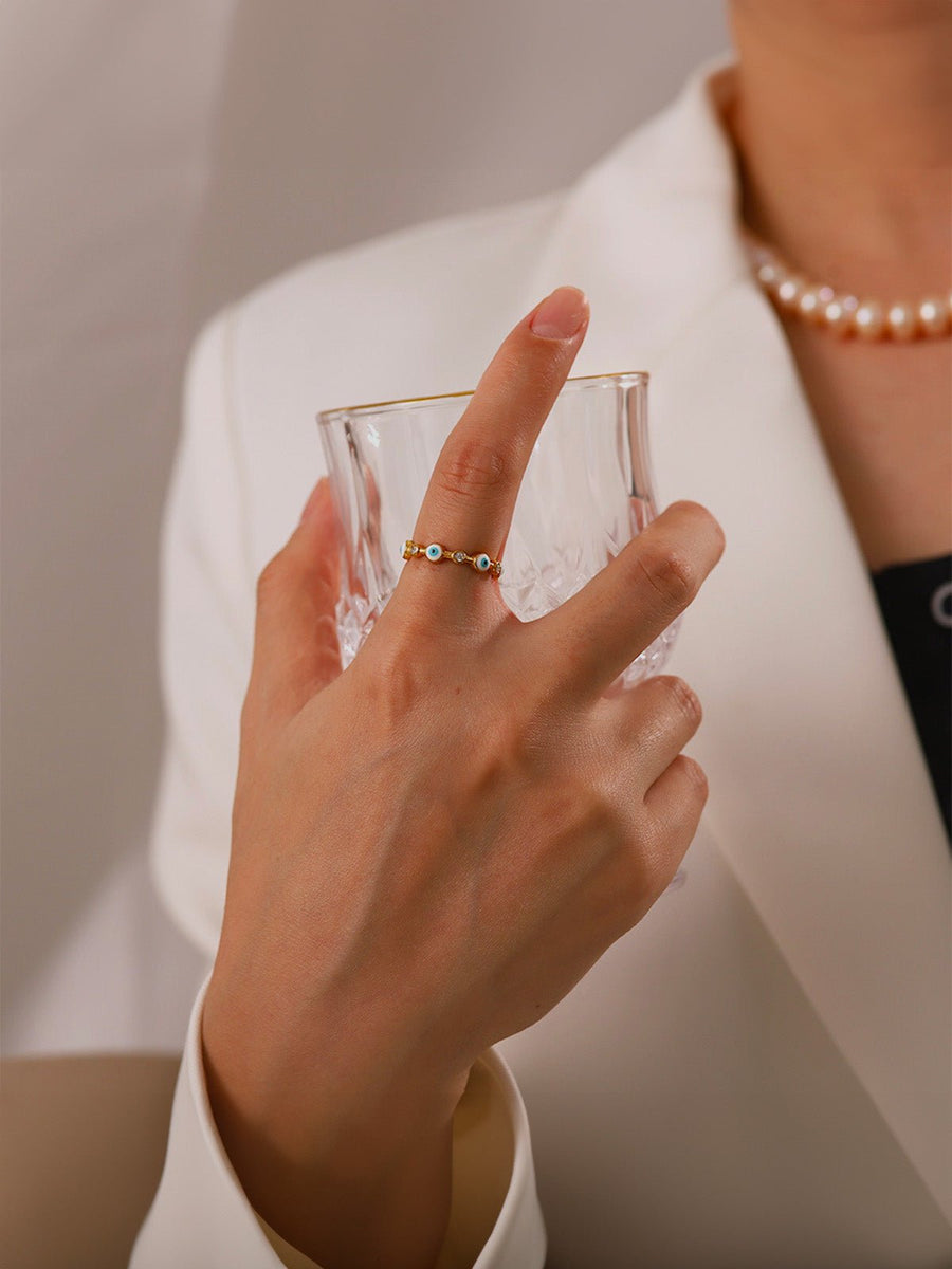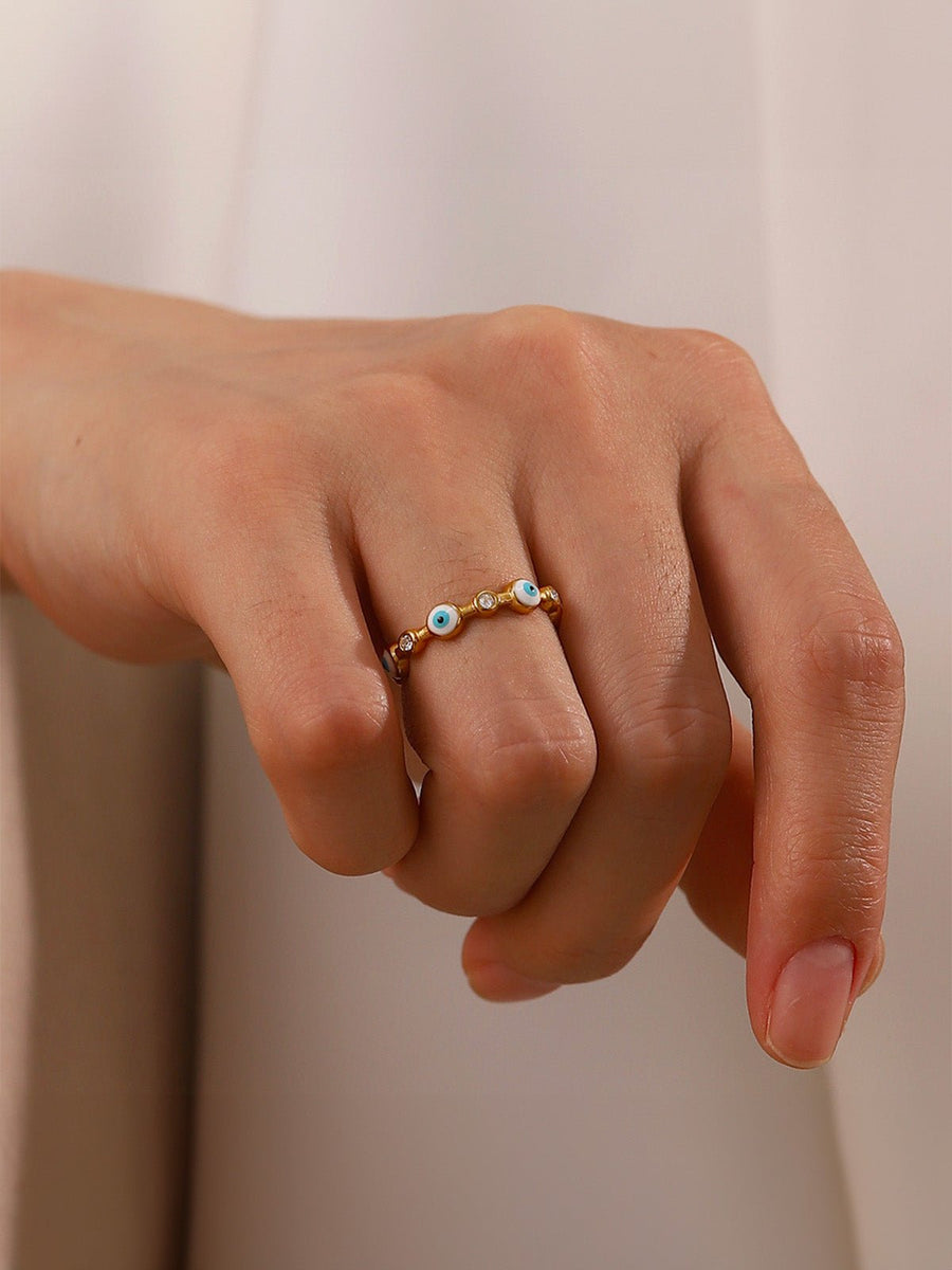 Anello occhio protettivo, acciaio dorato, pietra bianca, regolabile, stile geometrico, modello Valérie