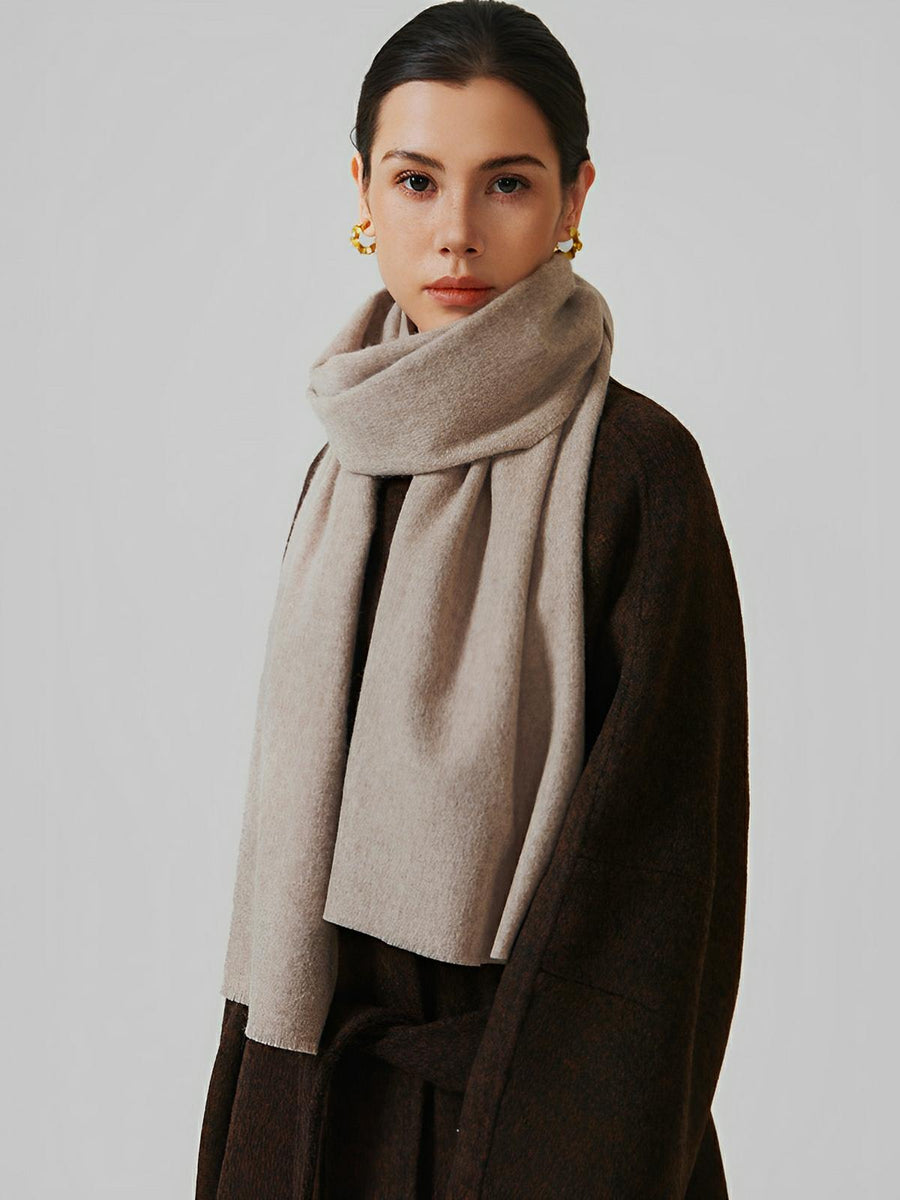 Sciarpa in lana morbida tinta unita, formato lungo, calore invernale, comfort naturale, stile essenziale, modello Bérénice