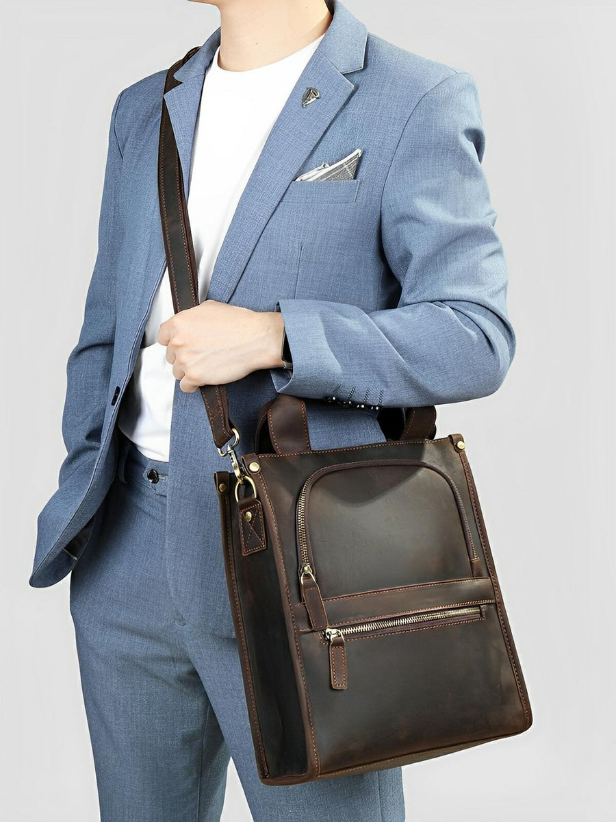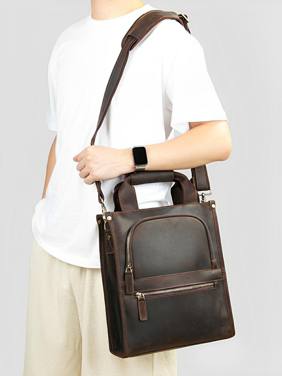 La tracolla regolabile e rimovibile garantisce un comfort personalizzato, mentre le maniglie rinforzate offrono un'alternativa elegante per il trasporto a mano. Con la sua finitura in pelle marrone vintage e i dettagli in metallo robusto, questa borsa è perfetta per l'uso quotidiano, sia in ufficio, in viaggio o per uscite informali.