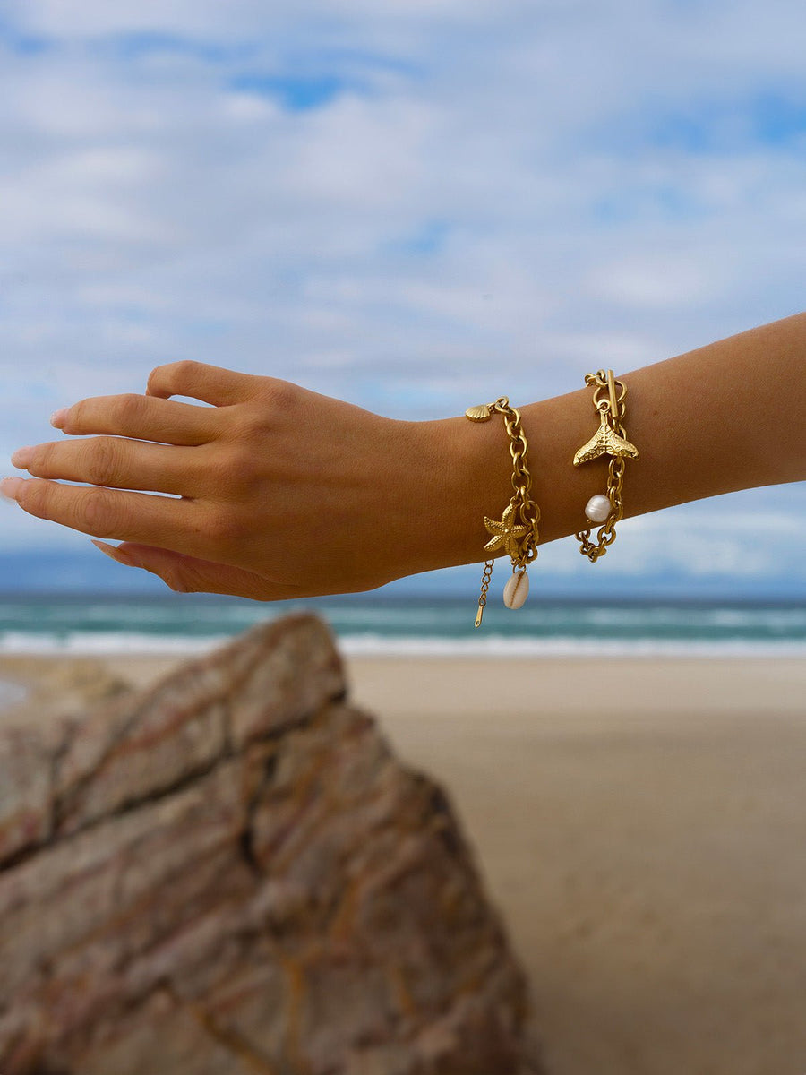 Questo bracciale a catena dorata cattura lo spirito delle vacanze con le sue charms ispirate al mare: una conchiglia bianca, una silhouette di pesce stilizzata e una conchiglia dorata. La chiusura OT aggiunge un tocco di tendenza garantendo al contempo una chiusura rapida e sicura.