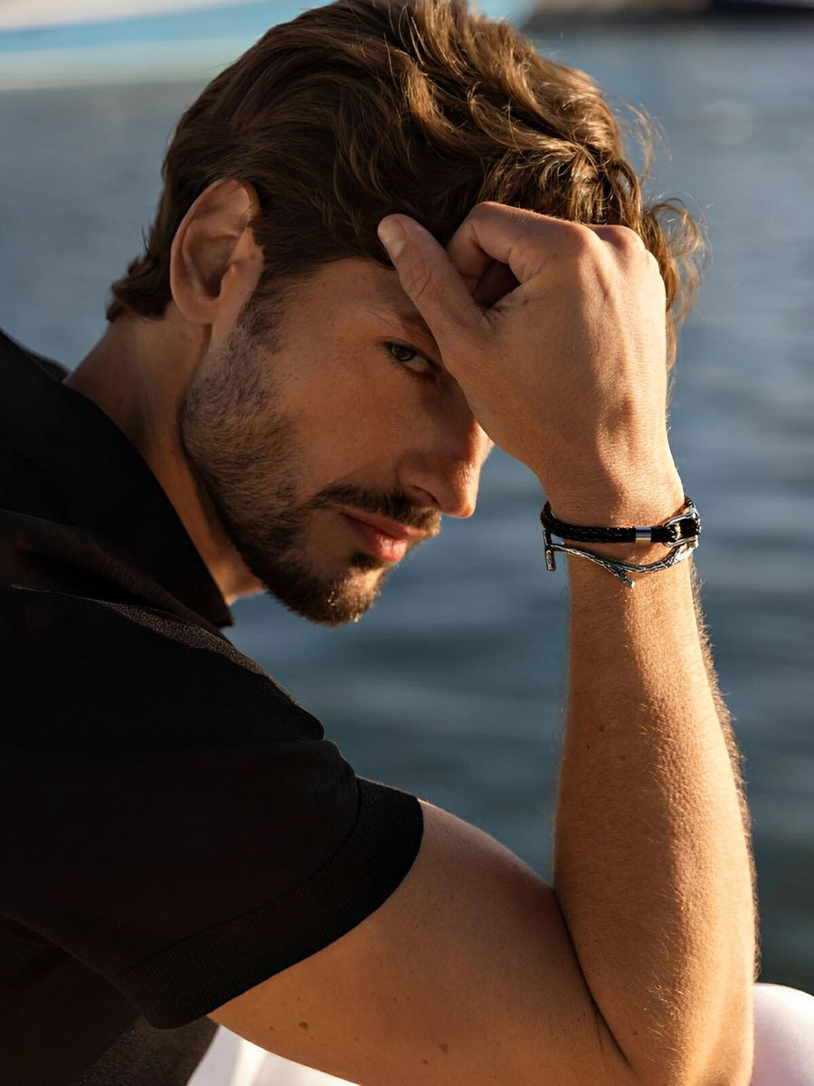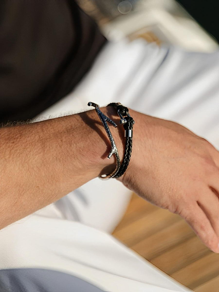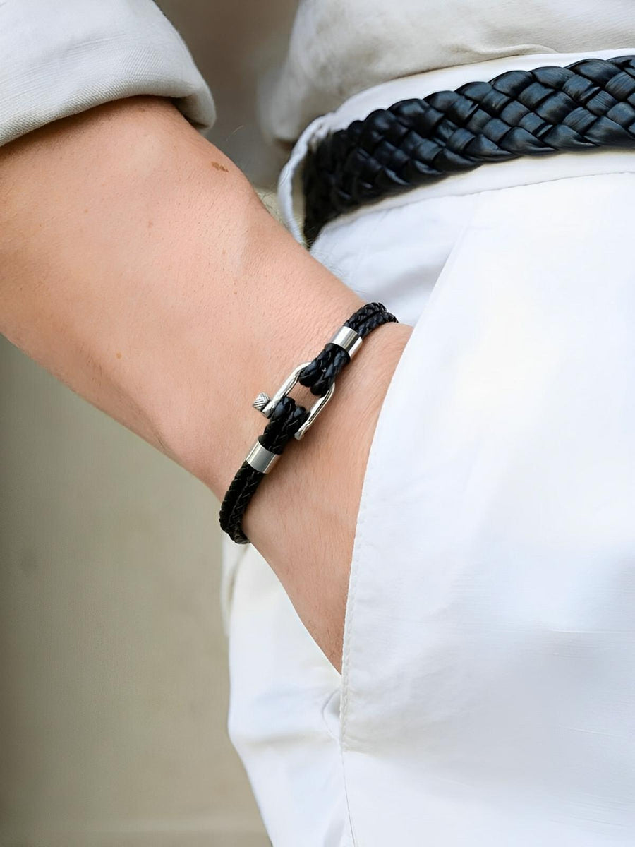 Questo bracciale in pelle intrecciata è un accessorio maschile dallo stile deciso. Realizzato con un doppio giro di pelle di alta qualità, offre un look sofisticato e moderno che si adatta a qualsiasi outfit.