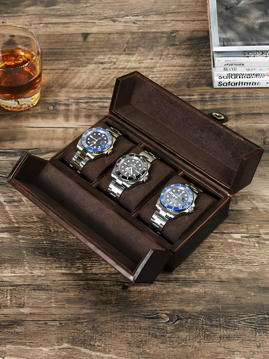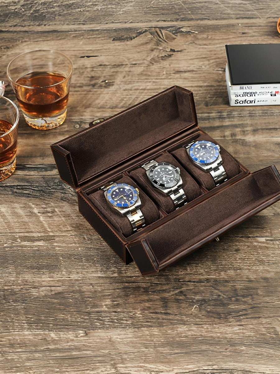 Proteggete e valorizzate la vostra collezione con questo cofanetto portagioie per orologi in pelle, progettato per accogliere fino a tre orologi. Il suo design raffinato unisce un esterno in pelle pieno fiore e un interno in velluto morbido che protegge i vostri preziosi segnatempo da graffi e urti.