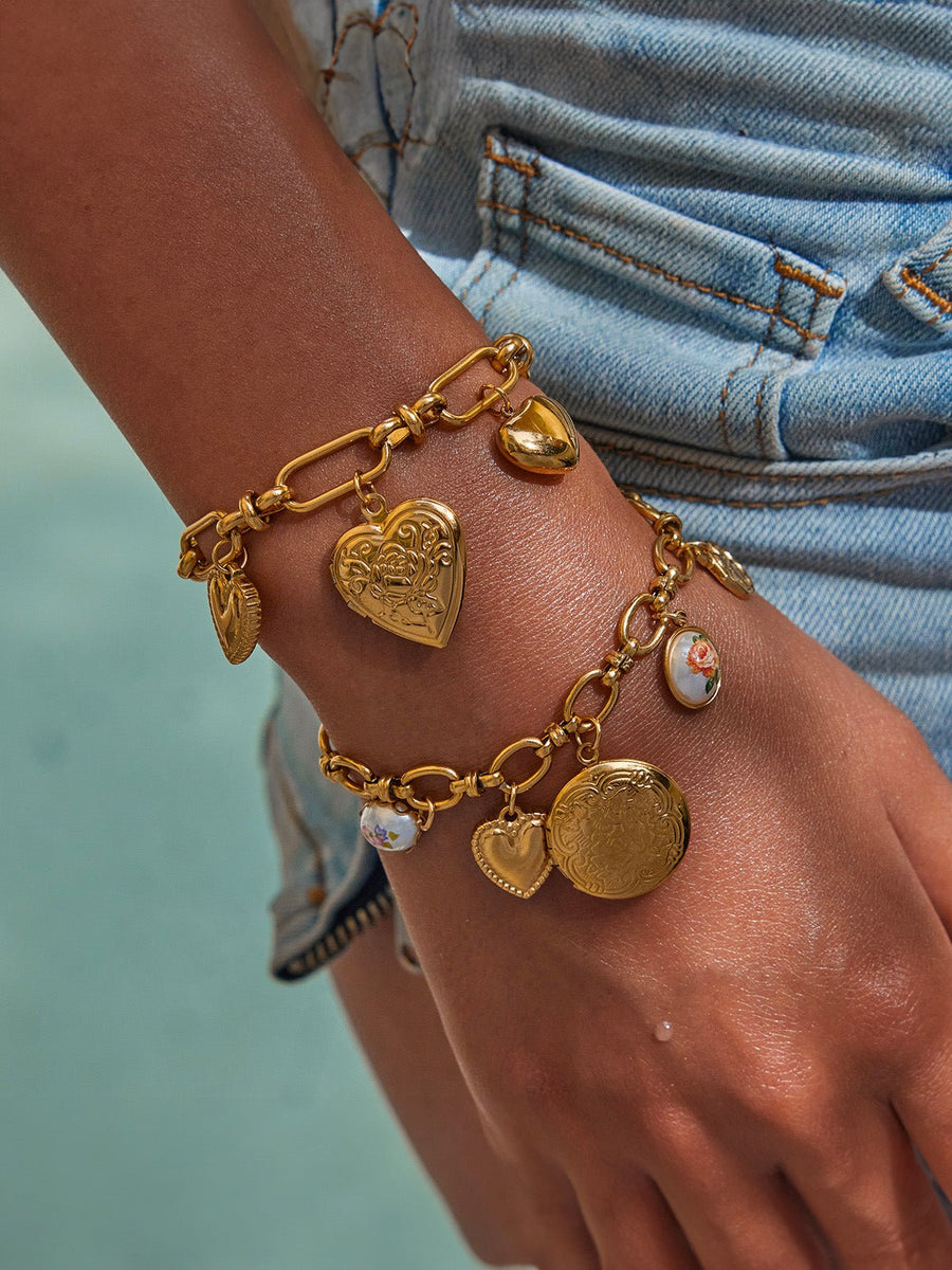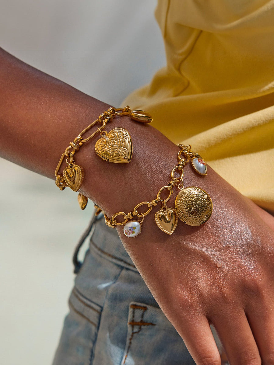 Questo bracciale dorato conquista con il suo stile romantico e i suoi charms a forma di cuore finemente lavorati. Realizzato in acciaio inossidabile, offre una resistenza eccezionale nel tempo e non si ossida.