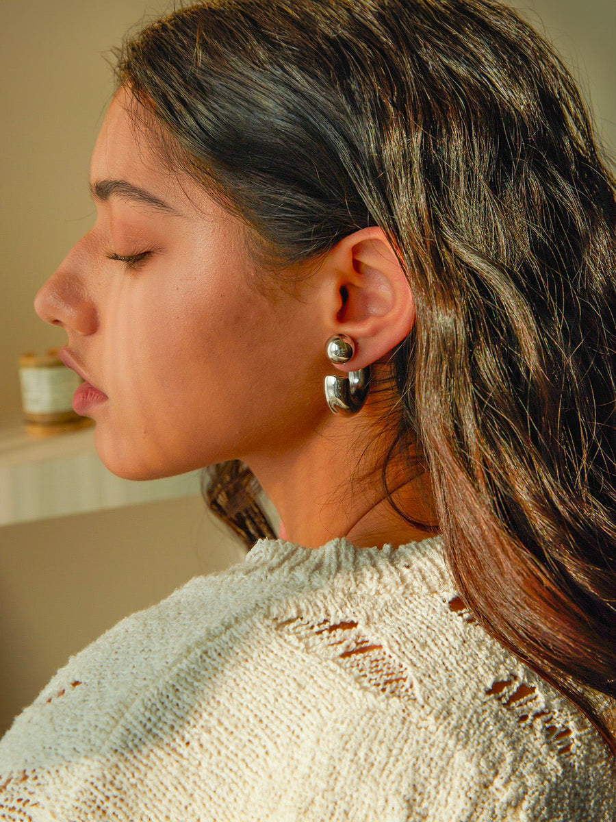 Questi orecchini geometrici a forma di C affascinano per la loro silhouette bombata e la brillantezza effetto specchio. Realizzati in acciaio inossidabile con placcatura oro 16K o finitura argentata, offrono una luminosità intensa e una tenuta eccezionale. Grazie al loro design unico a due parti, possono essere indossati in due modi: solo la sfera per uno stile discreto, oppure l’orecchino completo per un look deciso.