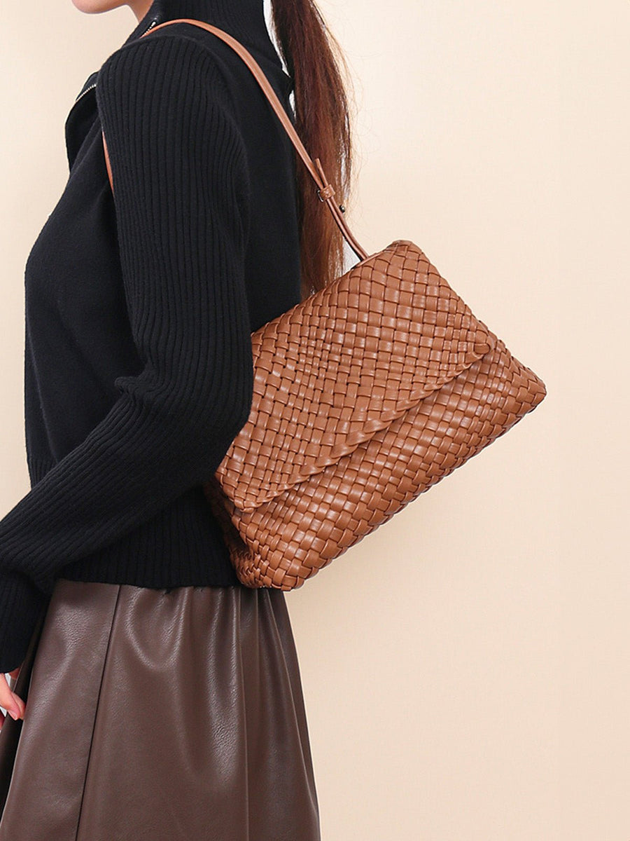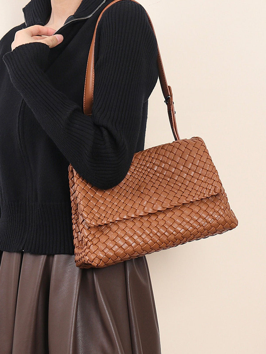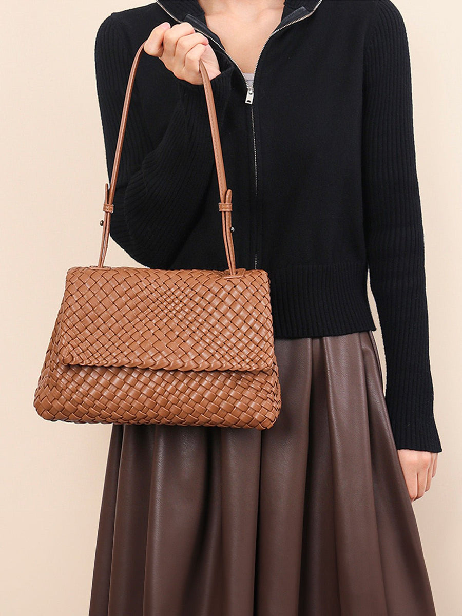 Borsa a mano intrecciata, formato medio, da portare a spalla o a mano, similpelle vegana marrone, patta con chiusura magnetica, modello Cherifa