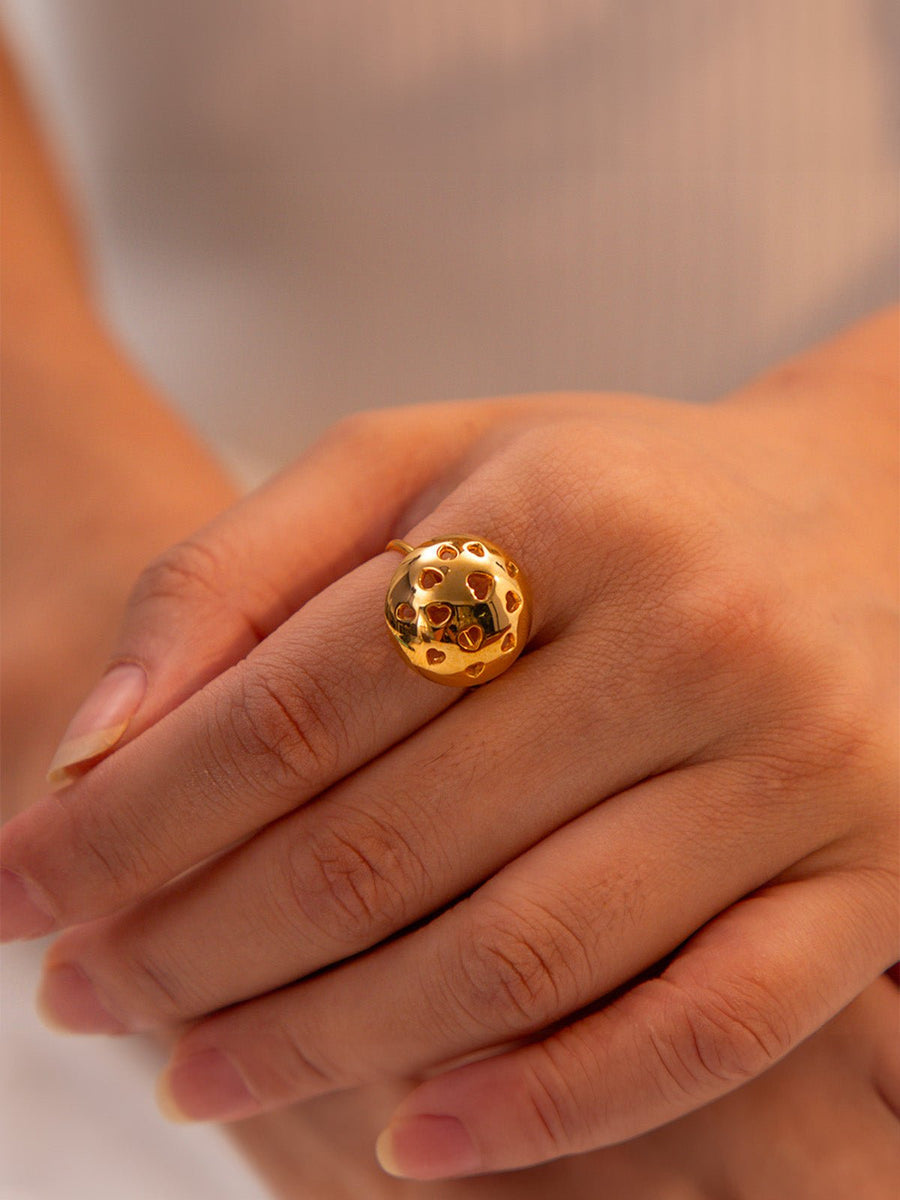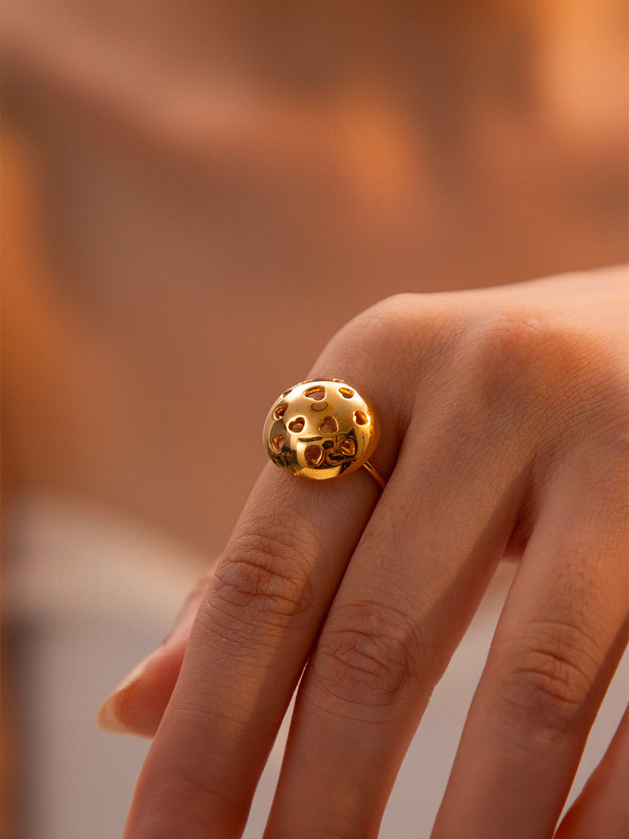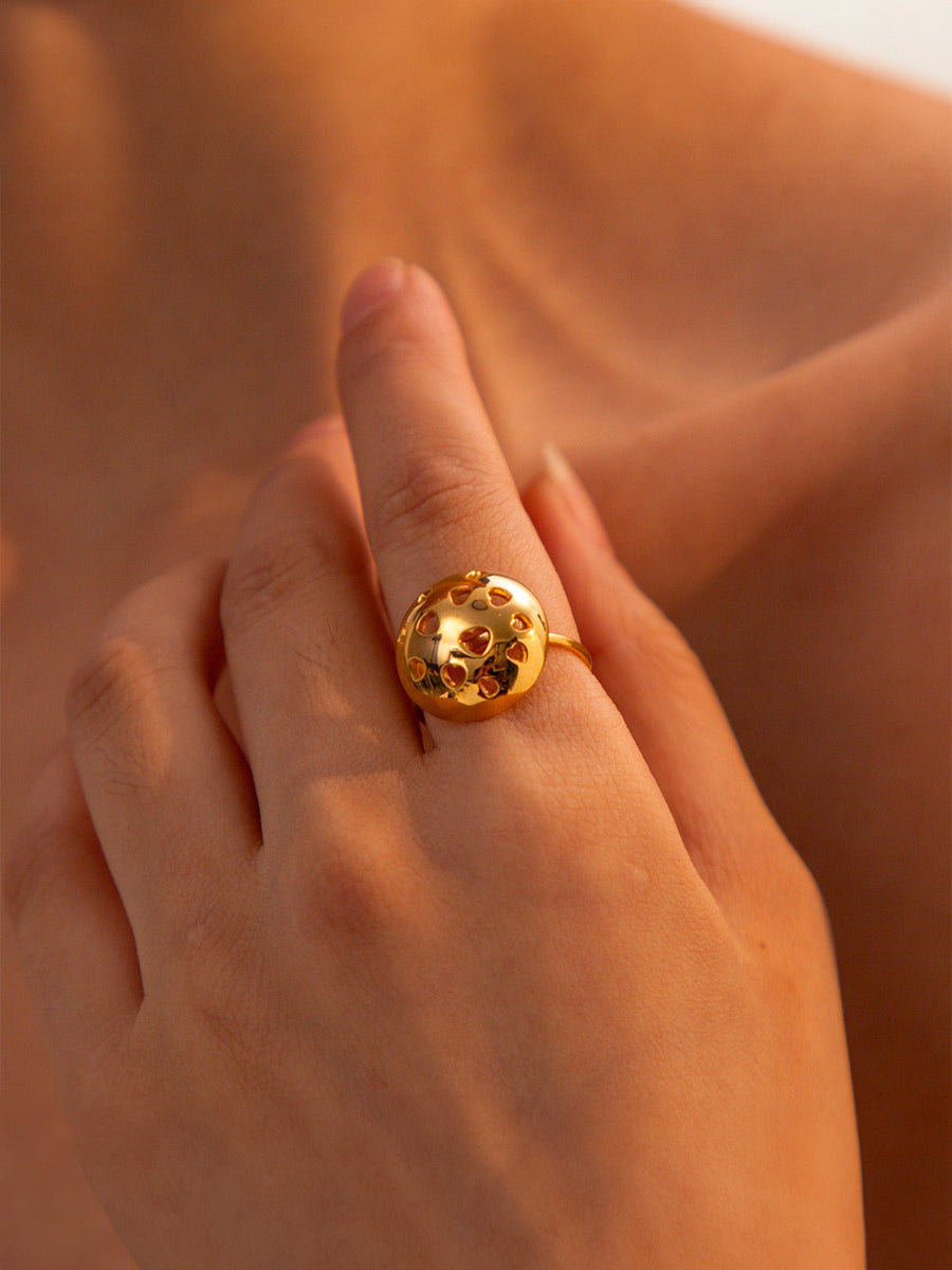 Lasciatevi conquistare da questo anello dorato regolabile dal design deciso. La sua forma bombata semi-sferica è delicatamente traforata con piccoli motivi a forma di cuore, che giocano con la luce per un effetto luminoso ed espressivo. Il placcatura in oro 18K applicata sottovuoto garantisce una brillantezza intensa e ne aumenta la durata.