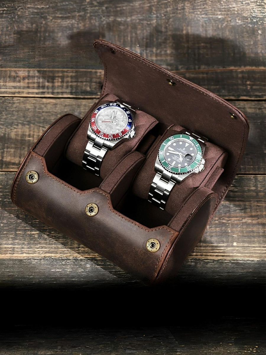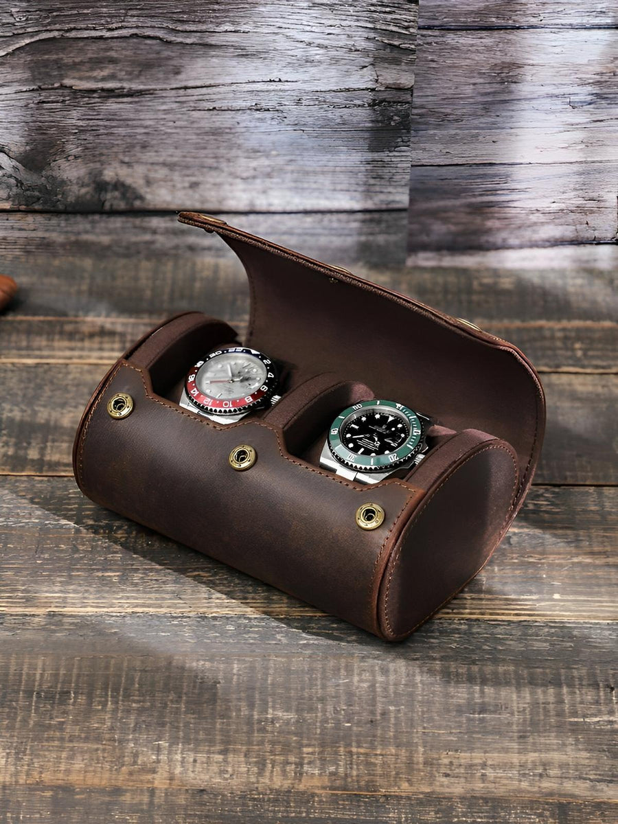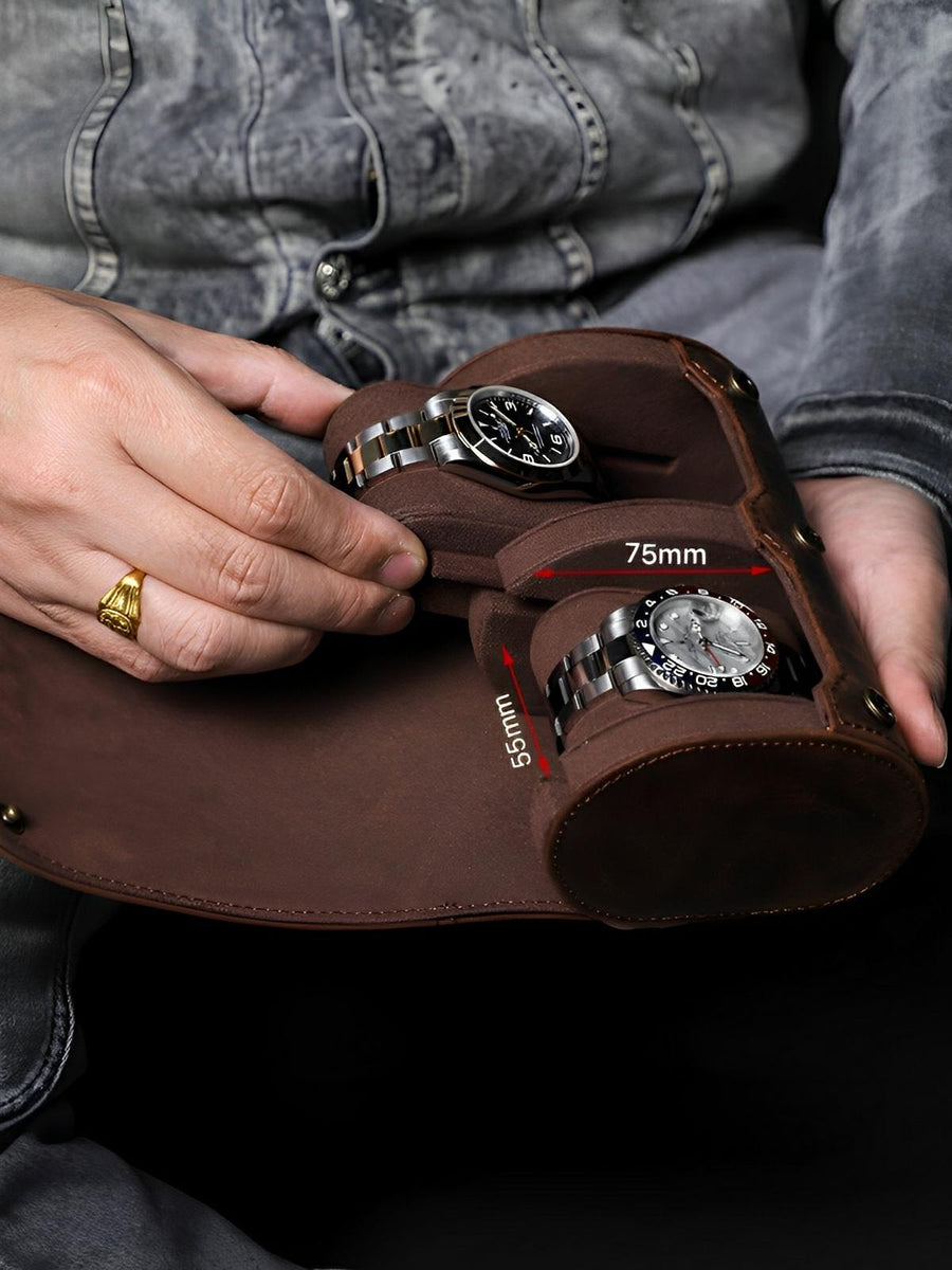 Questo cofanetto è pensato per contenere due orologi, con cuscini individuali che garantiscono una tenuta ottimale. Il suo design elegante a forma di rotolo e la chiusura sicura con bottoni a pressione lo rendono un accessorio tanto pratico quanto raffinato, ideale sia per la conservazione in casa che per i viaggi.