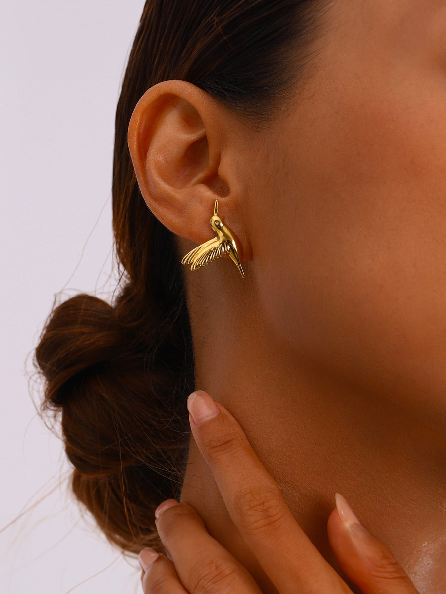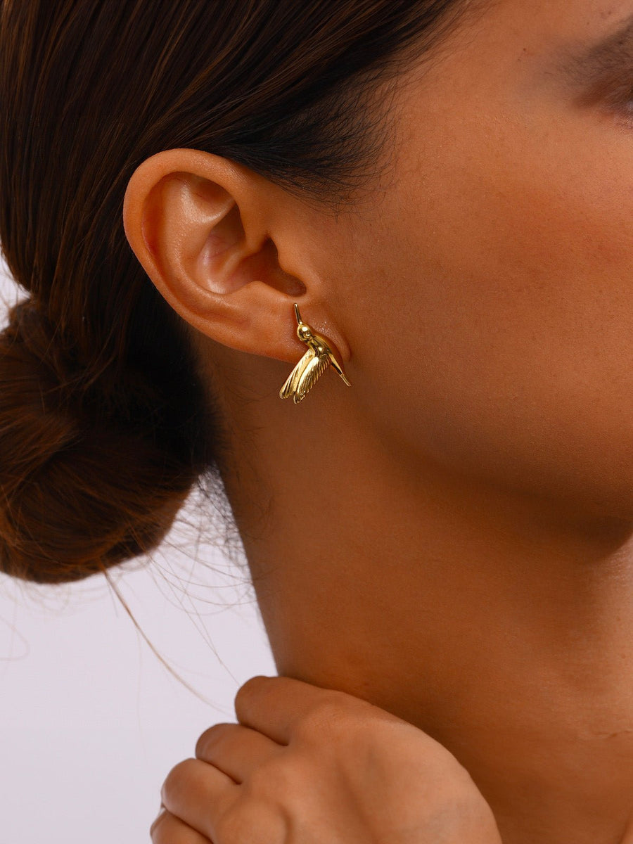Questi orecchini a forma di colibrì dorato catturano la grazia di un uccello in volo. Il loro design scultoreo e audace valorizza il lobo con un effetto sorprendente, pur restando leggeri e piacevoli da indossare.