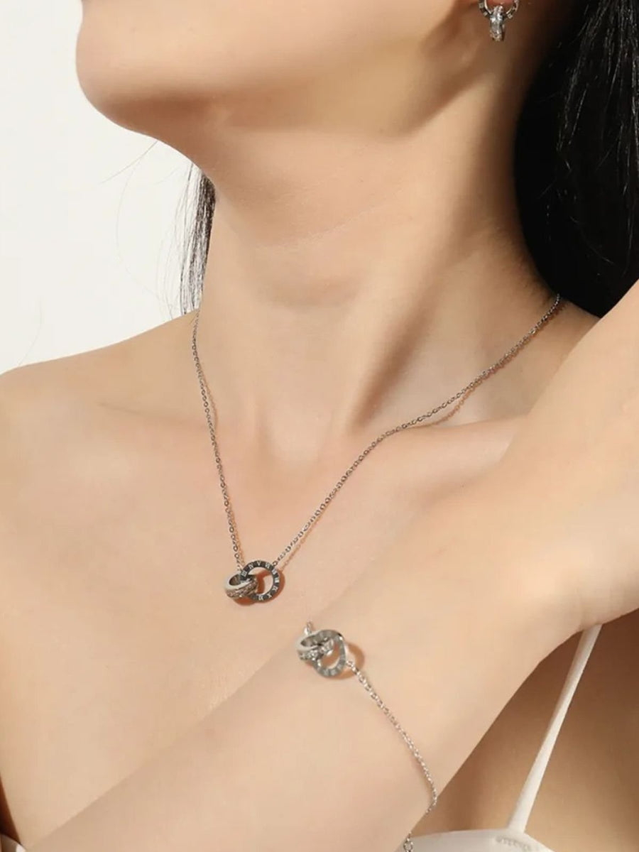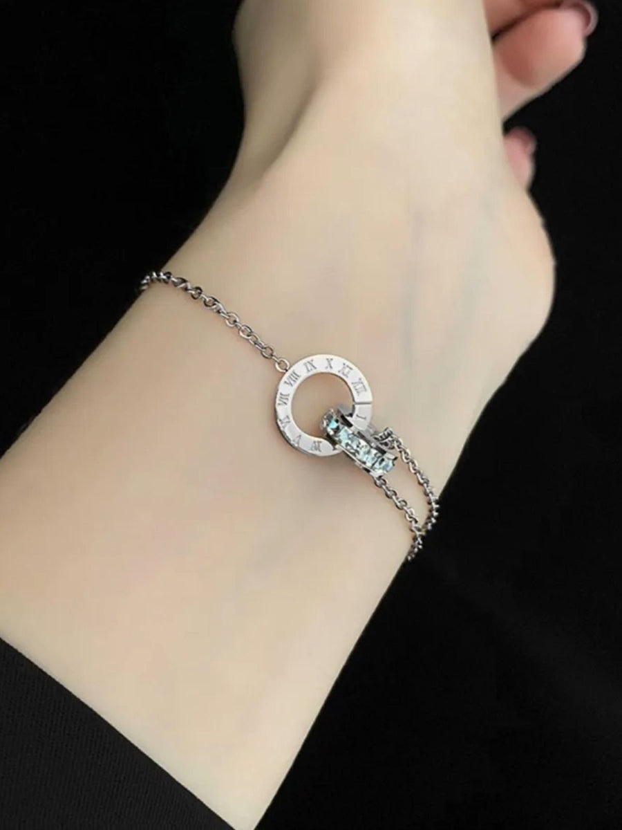 Il suo design a doppia catena mette in risalto una composizione elegante di cerchi intrecciati, impreziositi da numeri romani incisi e cristalli scintillanti. Ogni dettaglio è stato pensato per creare un gioiello armonioso e simbolico, ideale per le donne sensibili alla bellezza dei bijoux ricchi di significato.