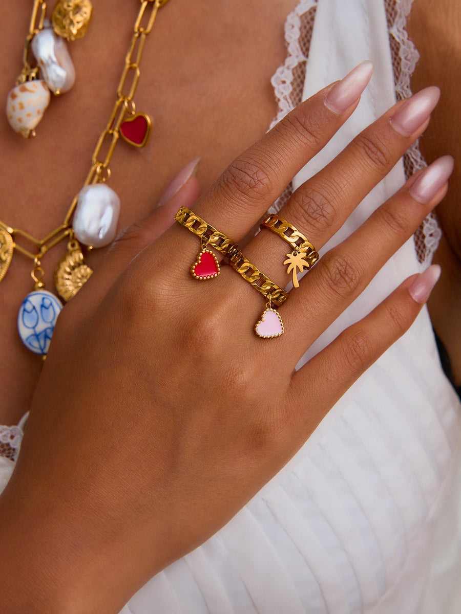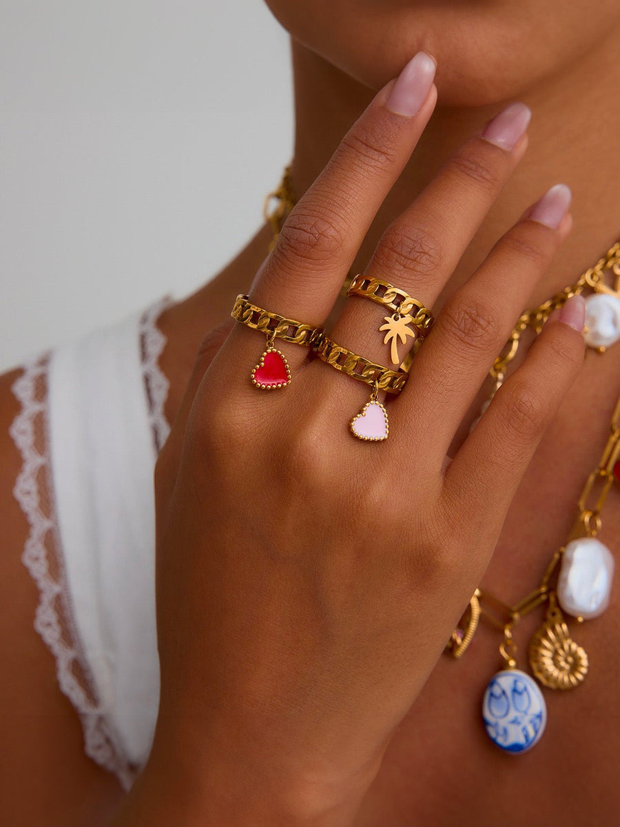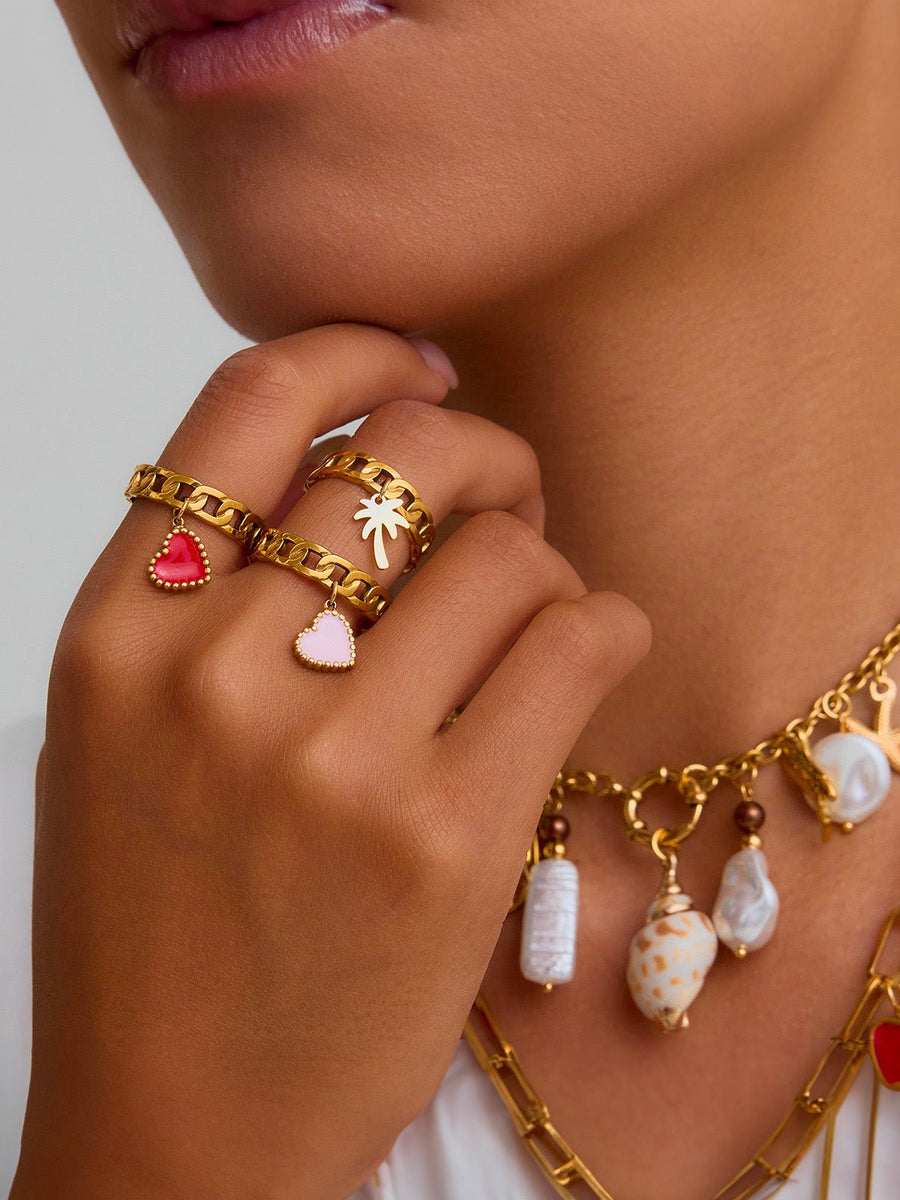 Questo anello a catena dal design deciso unisce modernità e fantasia grazie al suo pendente sospeso, disponibile a forma di cuore colorato o di palma stilizzata. Realizzato in acciaio inox dorato, resiste all’usura quotidiana aggiungendo al contempo un tocco di calore ai vostri outfit.