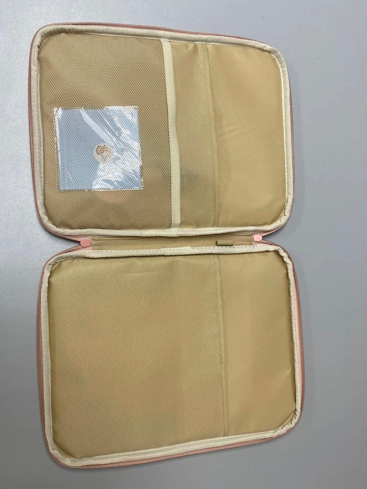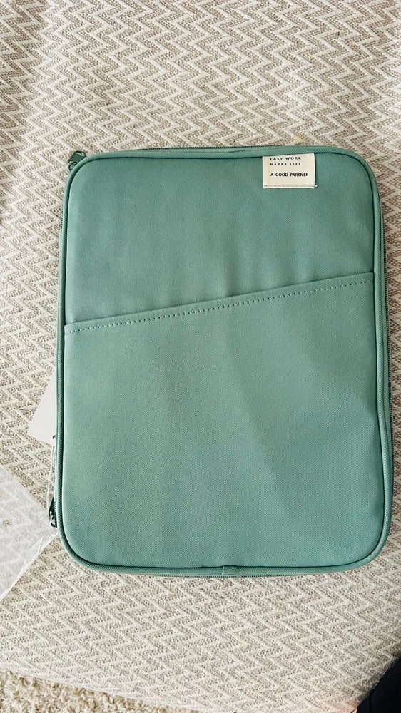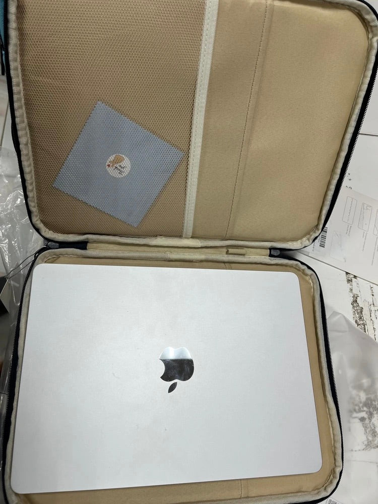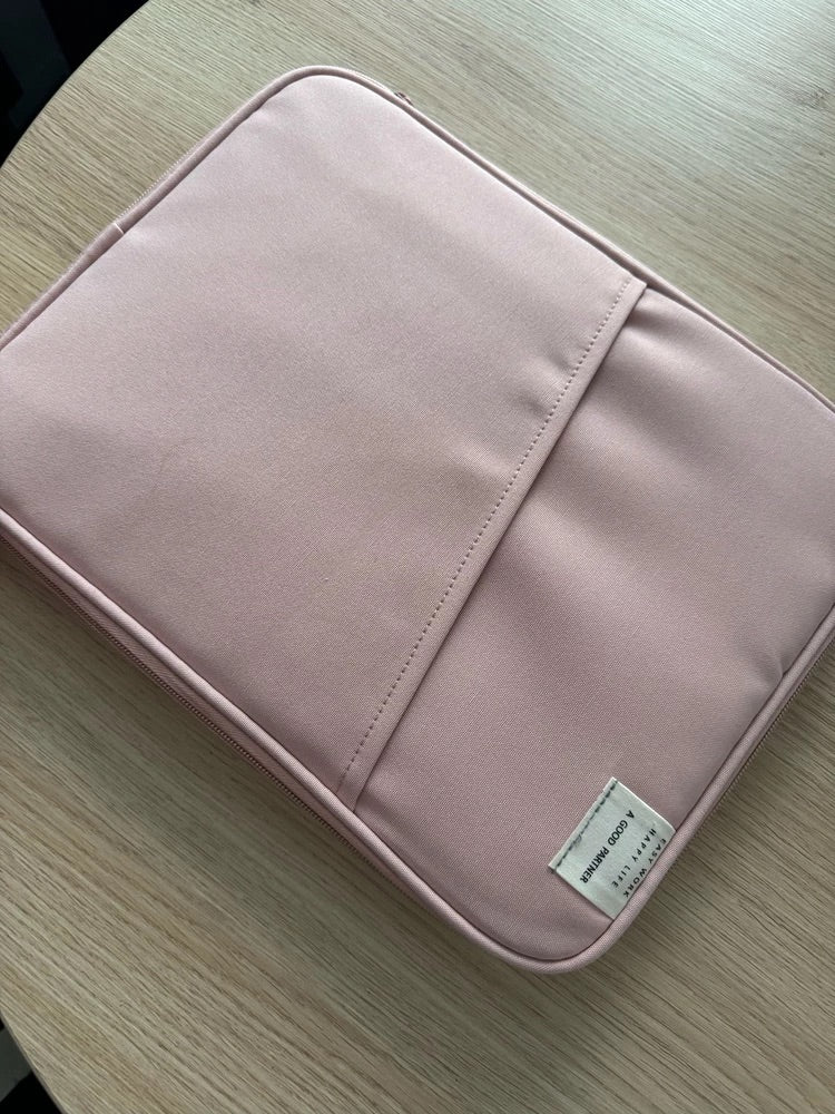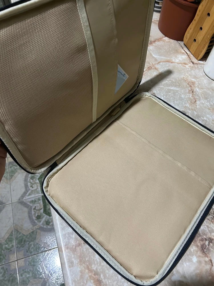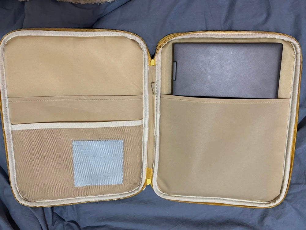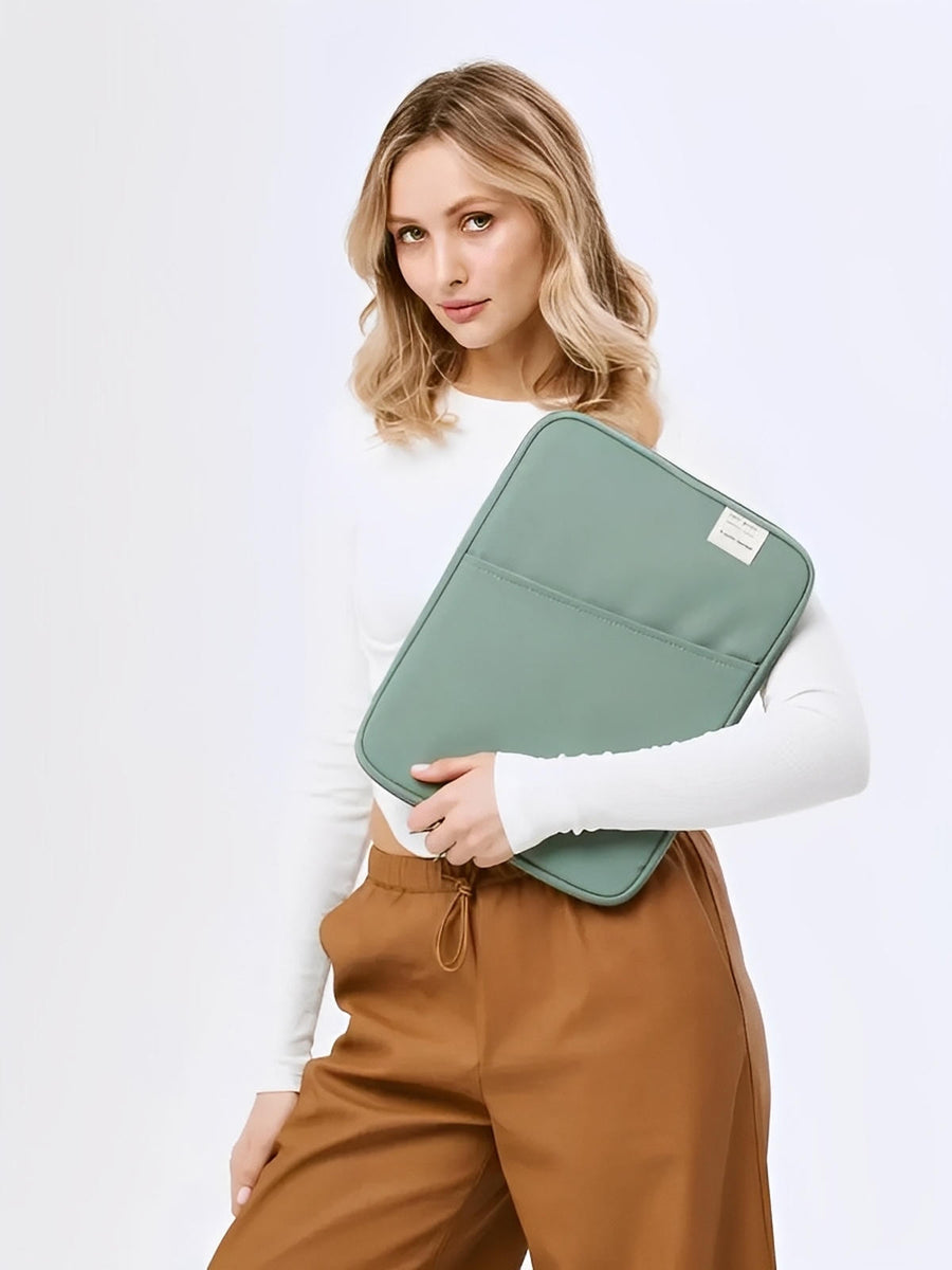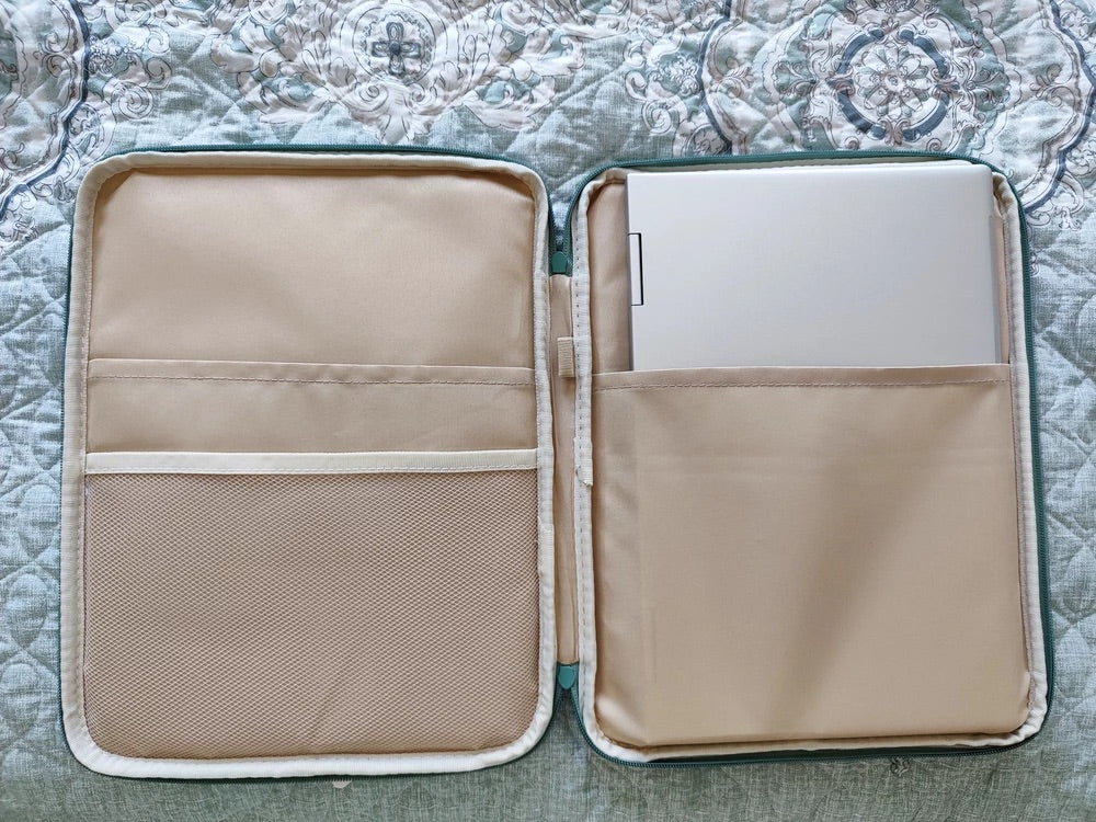 L’esterno è realizzato in poliestere idrorepellente che protegge il vostro dispositivo dall’umidità, mentre l’interno beige morbido attutisce i piccoli urti. Un compartimento principale ben imbottito accoglie il vostro dispositivo, e una tasca frontale con zip consente di organizzare i vostri accessori essenziali come mouse, cavi o penne.