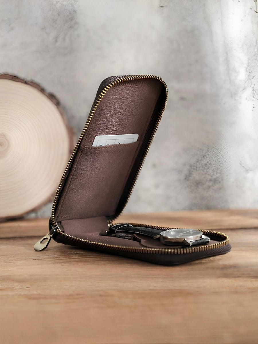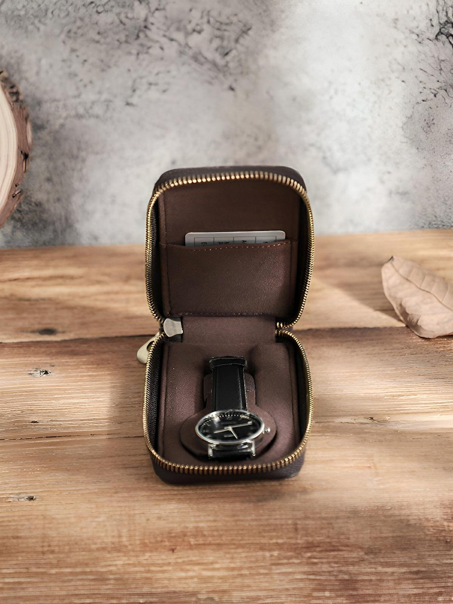 Offrite alla vostra orologio una protezione ideale con questo cofanetto porta orologio in pelle dal formato compatto e raffinato. Progettato per l’uso quotidiano o in viaggio, garantisce una sicurezza massima al vostro orologio grazie alla sua cerniera robusta. L’esterno in vera pelle dona un tocco distinto, mentre l’interno morbido protegge da graffi e urti.
