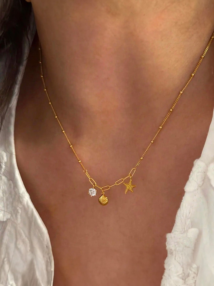 Lasciatevi conquistare dall’energia estiva di questa collana dorata a tema marino. Composta da una catena sottile arricchita da maglie piatte, è impreziosita da tre affascinanti ciondoli: una stella marina testurizzata, una conchiglia scolpita e una pietra in zirconia scintillante.