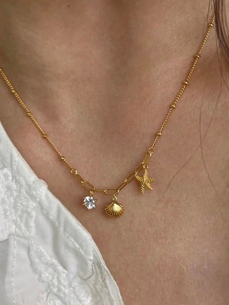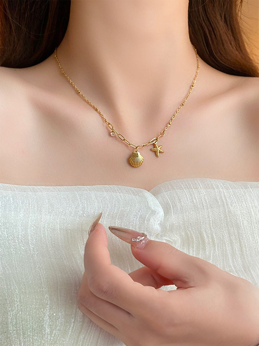 Collana con conchiglia dorata, pendente a stella marina, zircone, catena sottile in acciaio inox, stile spiaggia, donna, modello Dalida