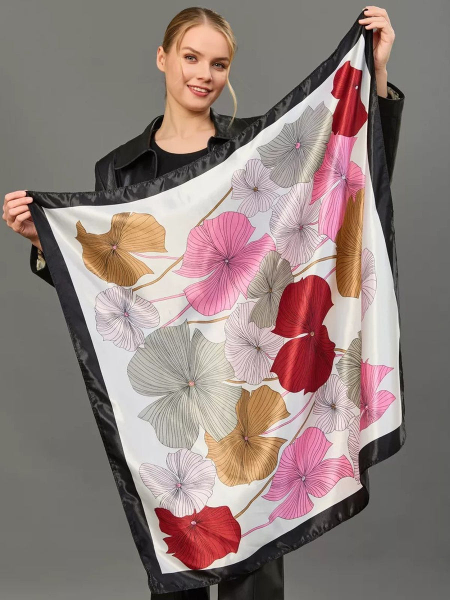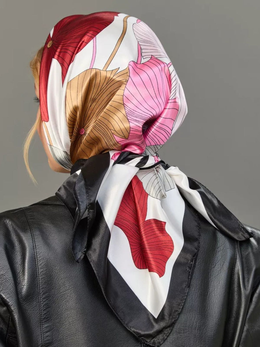 Foulard carré effet satiné, stampa floreale, grande formato, multiuso, morbido e brillante, accessorio per capelli o collo, modello Dannah