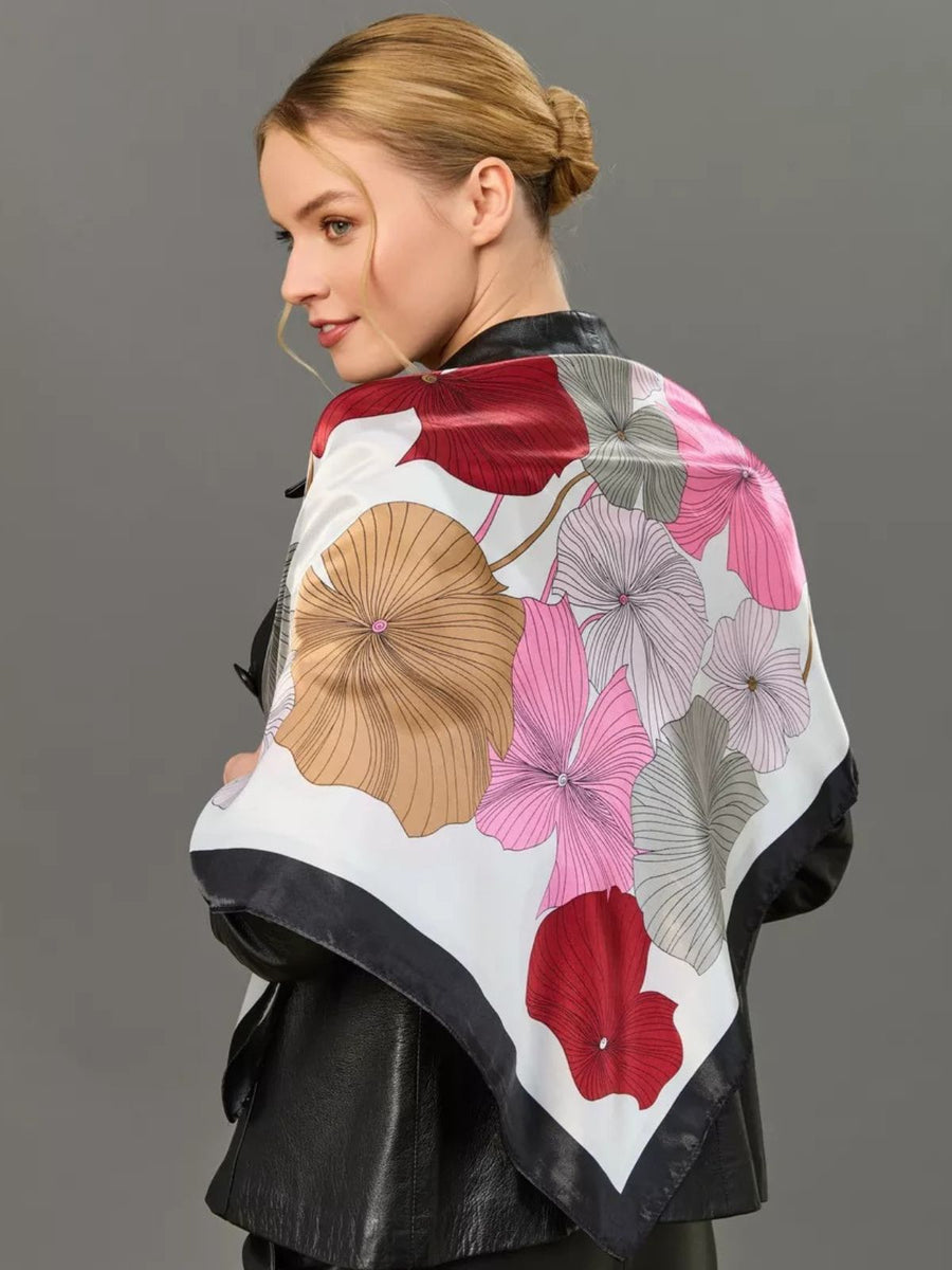 La sua stampa floreale grafica in tonalità naturali (bordeaux, rosa, dorato, grigio) conferisce al foulard uno stile deciso senza risultare appariscente. La finitura con orlo delicatamente cucito garantisce una tenuta impeccabile lavaggio dopo lavaggio.