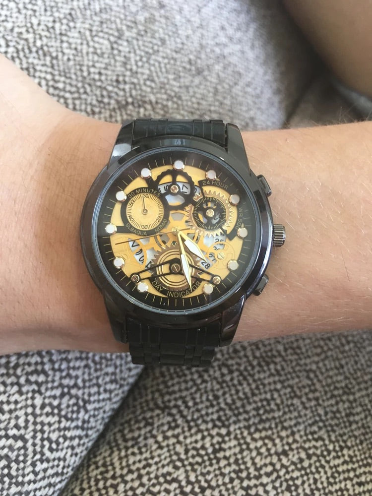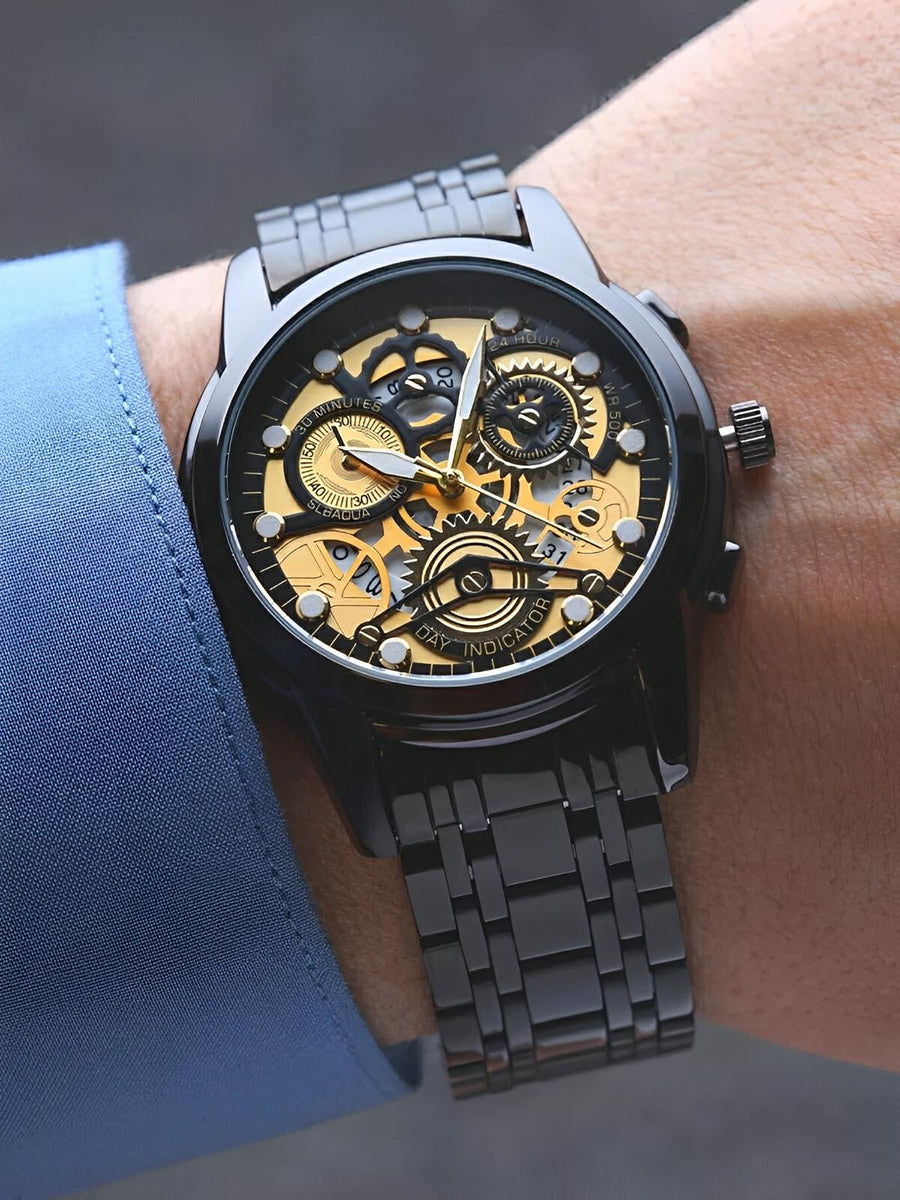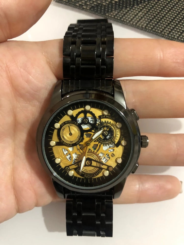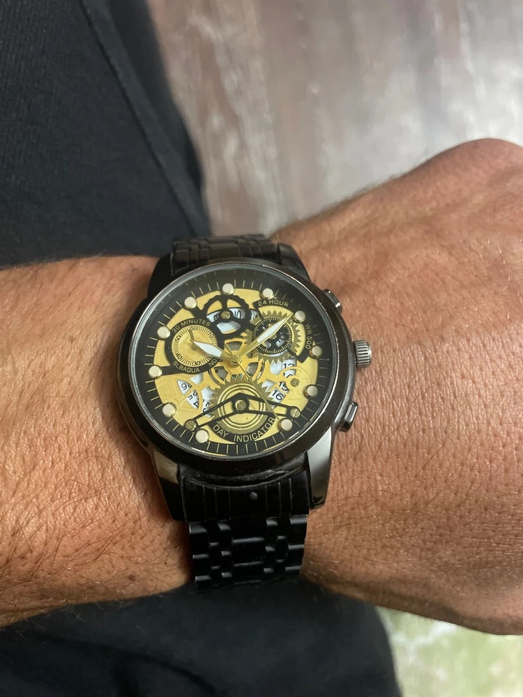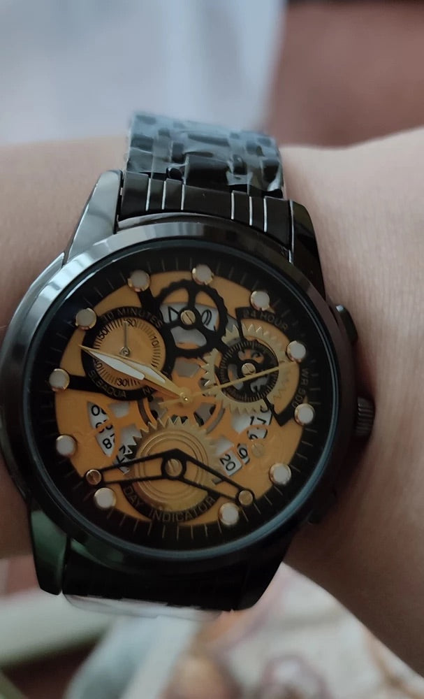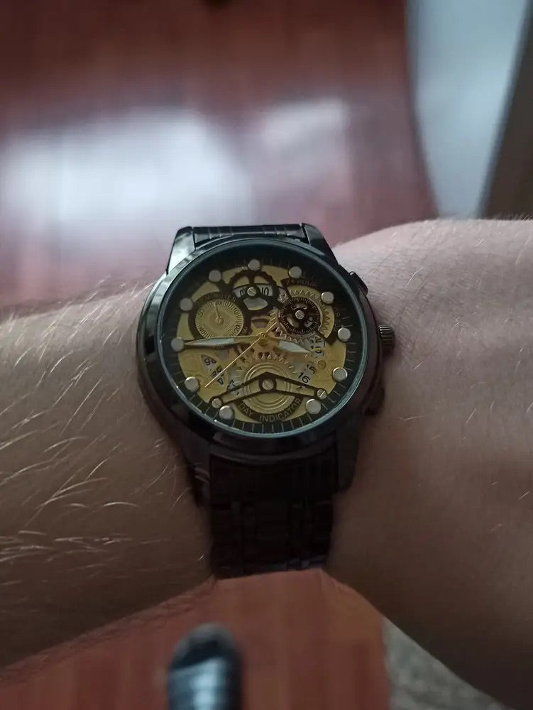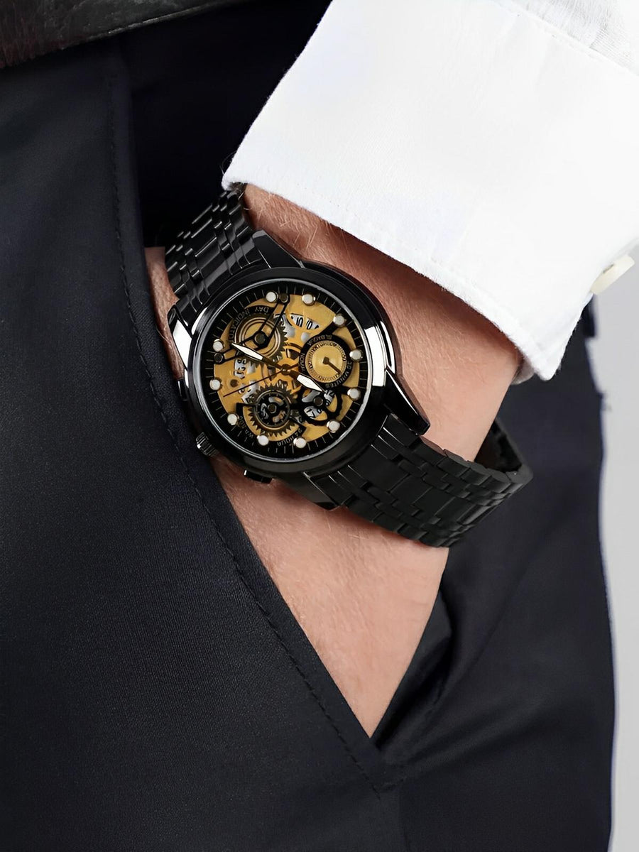 Orologio da uomo scheletrato, acciaio inossidabile, display analogico, movimento al quarzo, impermeabile, modello Darius