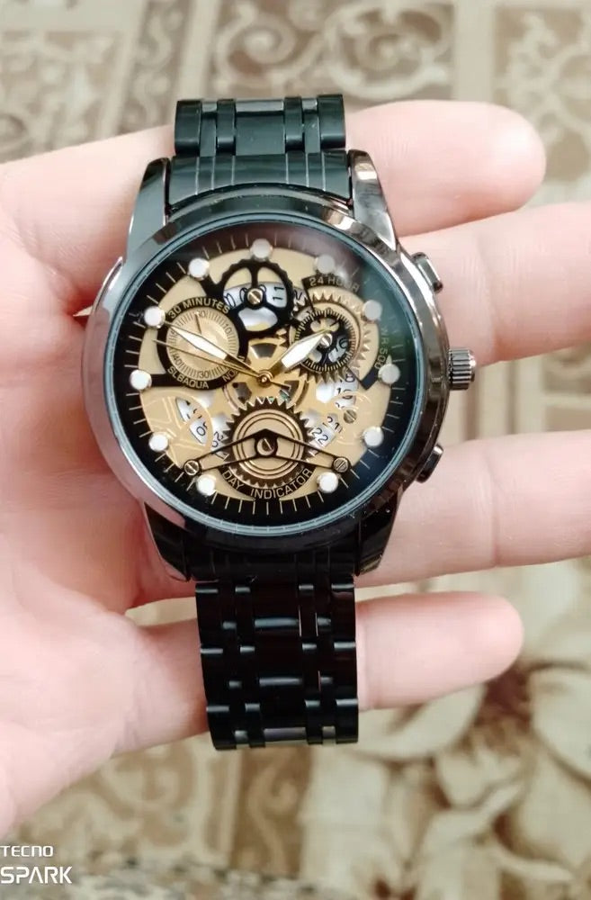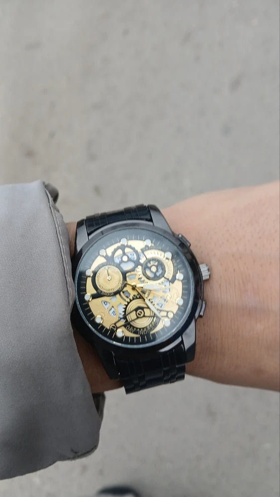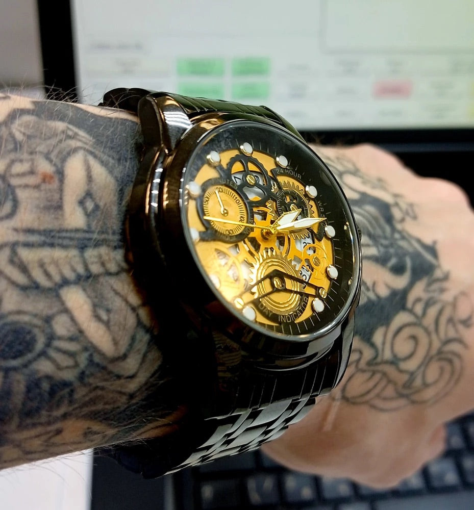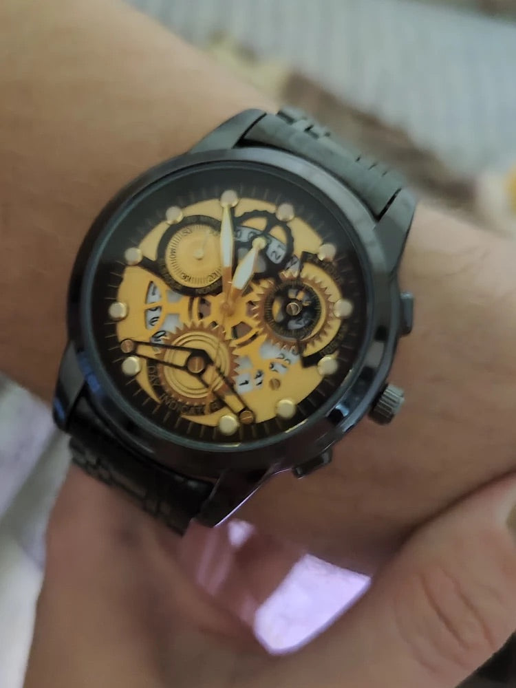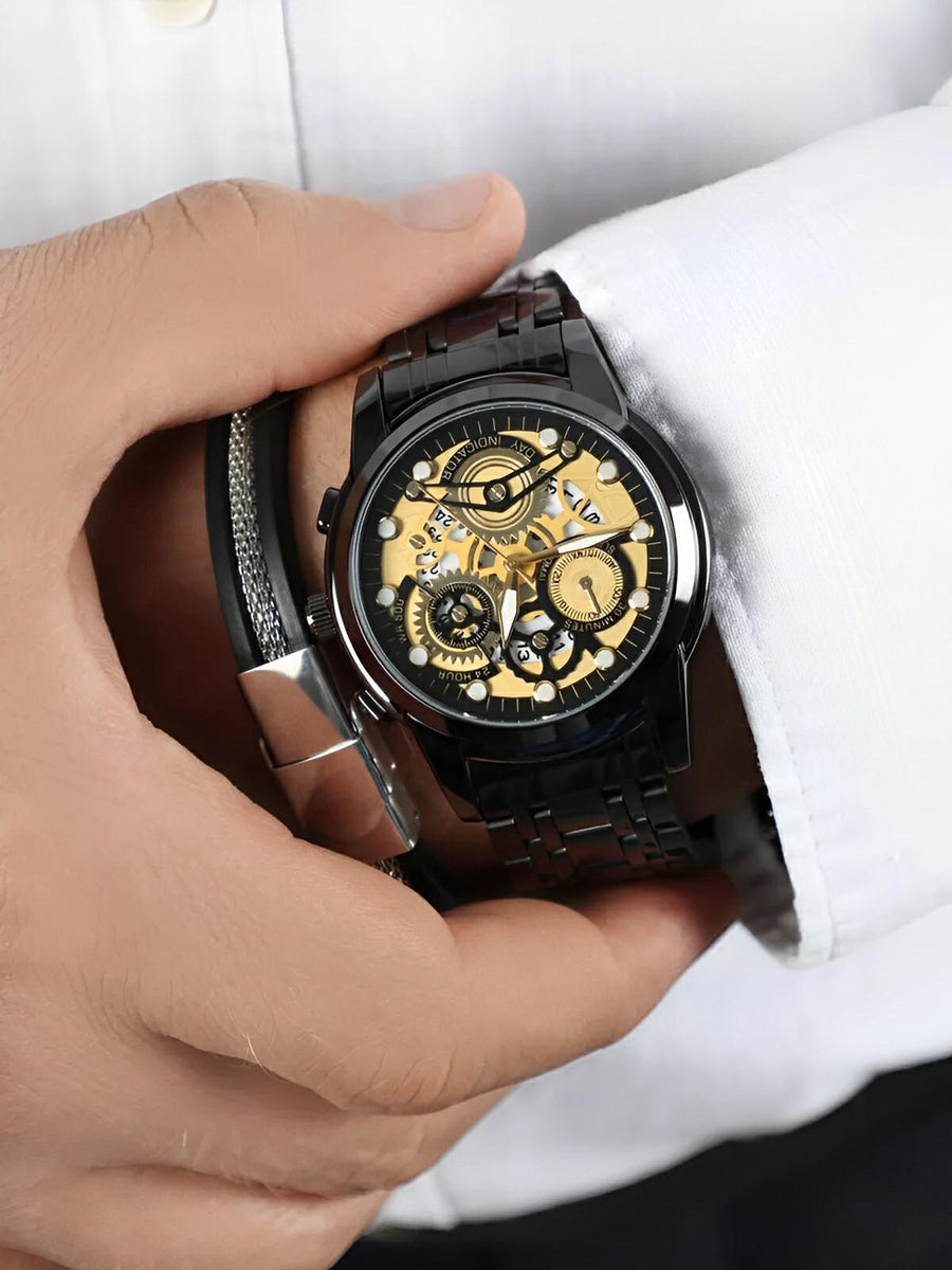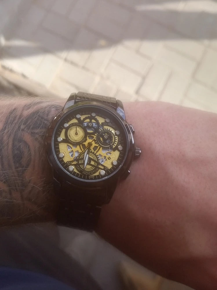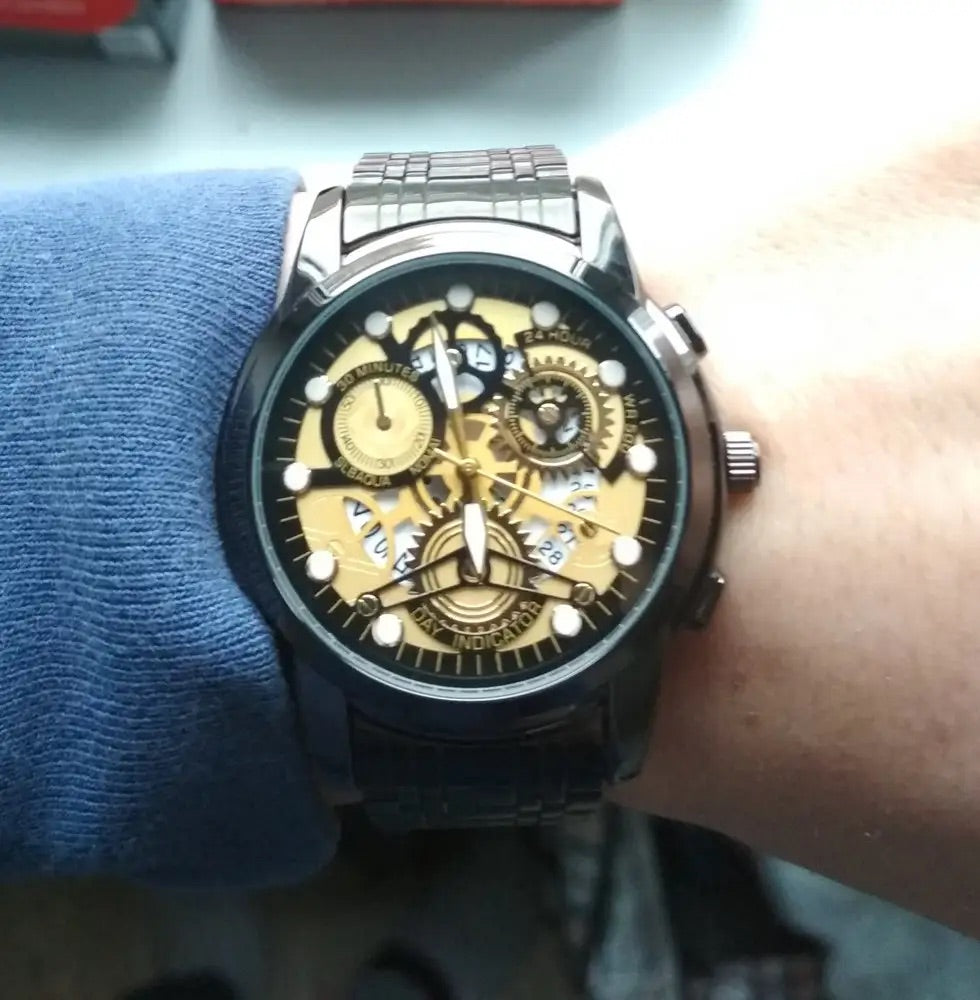 Orologio da uomo scheletrato, acciaio inossidabile, display analogico, movimento al quarzo, impermeabile, modello Darius